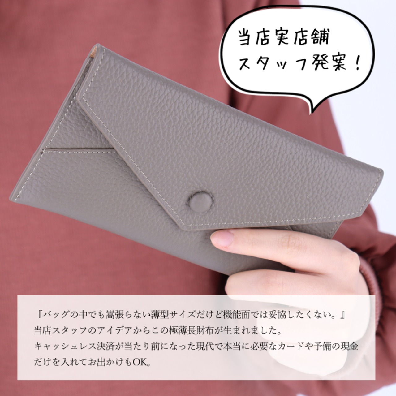 持ち歩きのストレス、ゼロへ。スタッフの「こんなの欲しかった」を形にした、超薄型・シンプル設計の本革スリム長財布。『持ち運びやすい薄型のお財布が欲しいけど機能は妥協をしたくない』当店実店舗スタッフのアイデアから超薄型の長財布が生まれました。僅か1cmの厚さですが小銭・お札・カードはしっかり分けて収納可能。手に優しく馴染む、上質な本牛革にシボ加工を施し高級感をプラス。キャッシュレス派にもおすすめのスマートなお財布です。