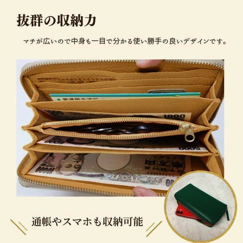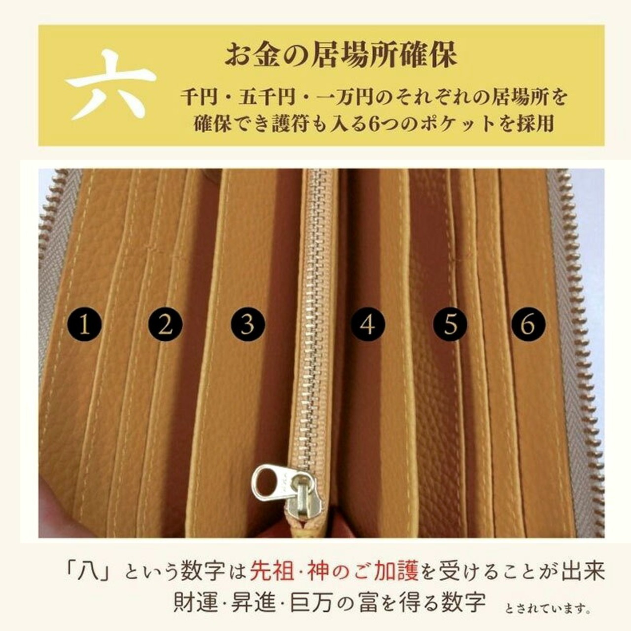 【サイズ(最大部を計測)】縦幅約10.5cm 横幅約20cm マチ約2.5cm 【重さ】約220g 【内側収納】小銭スペース×1、お札スペース×4、カードポケット×8、フリーポケット×2 【外側収納】無し 【留め具】ラウンドファスナー 【素材】牛革
