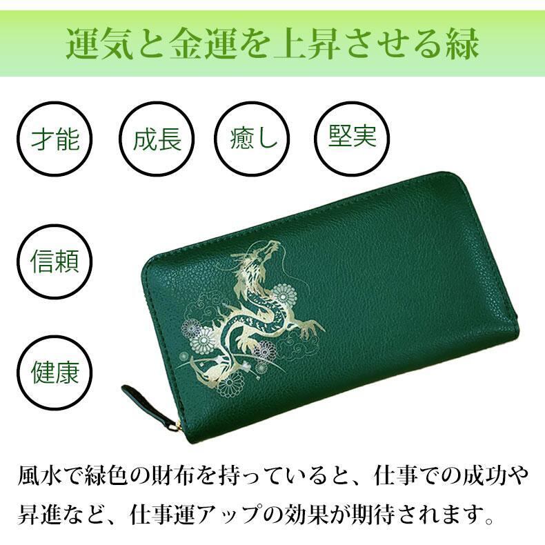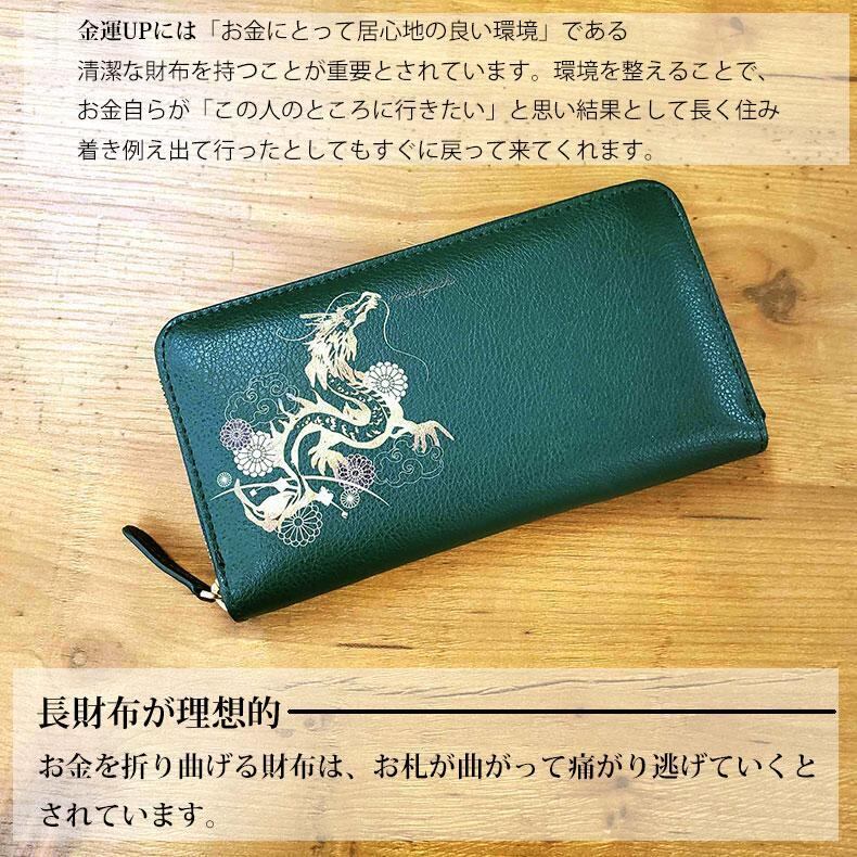 金運アップにこだわり抜いた究極の長財布の登場です。2025年の干支にちなんだ白蛇がお金をお守りします。人気の「開運財布」にさらに運気が上がりそうな蛇の箔押しデザイン。金運・財運上昇、開運、商売繁盛、交通安全、恋愛成就、子孫繁栄、技芸上達、合格祈願、長寿など、幅広いご利益があると信じられています。グリーンは樹木が育つ様に「金運を育てる」カラーとされています。如意宝珠を持った昇り龍をデザインしました。皇帝龍ゴールド護符カード符!ゴールドのダイヤモンドパイソン革お守り付き。