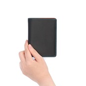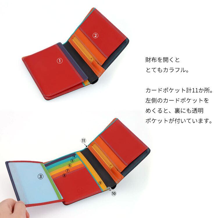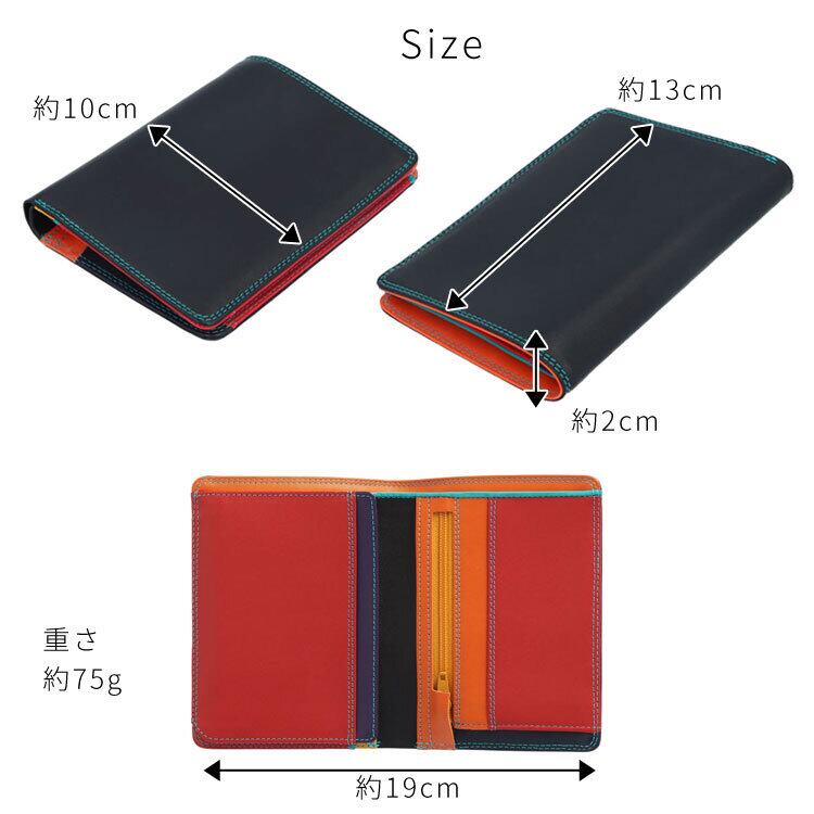 【サイズ(最大部を計測)】縦幅約13cm 横幅約10cm(開いた状態:約19cm) 厚み約2cm 【重さ】約75g 【内側収納】カードポケット×11、ファスナーポケット×1、お札スペース×1 【外側収納】無し 【留め具】ボタン 【裏地】有り 【素材】ナッパレザー(牛革)、ナイロン生地