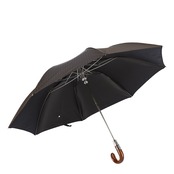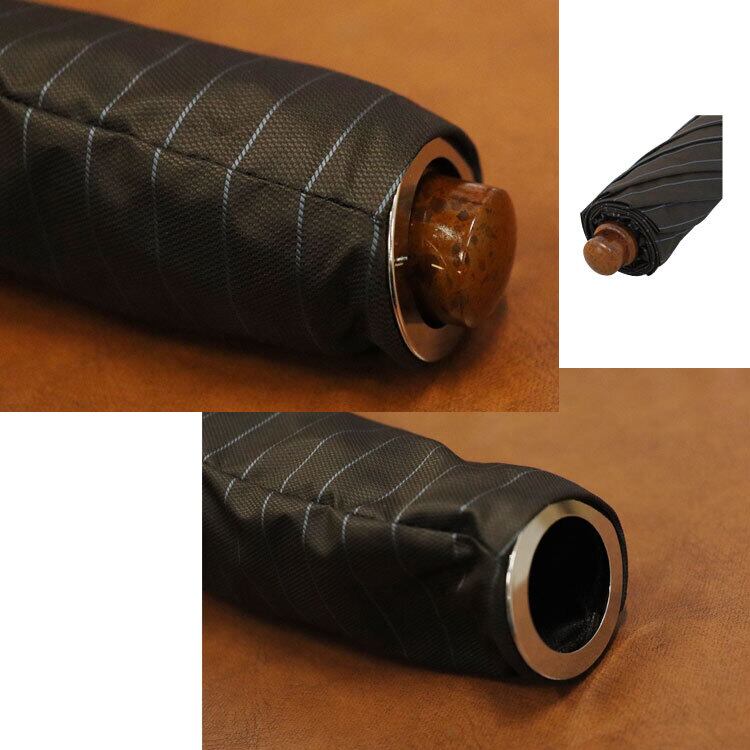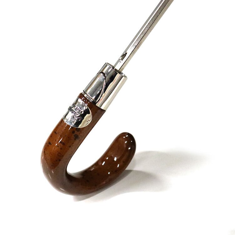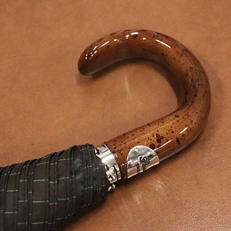 豊富なデザイン、スタイル、ハンドルのコレクションを誇る、他に類を見ない「Pasotti」イタリア国内で製造された唯一無二の傑作。高級感ある質感と深みのある色合いをした木のような樹脂製ハンドルが、傘全体の印象を洗練しています。さりげない水色のストライプ柄とマッチし、美しい傘となっております。プッシュで開け閉めできるジャンプ傘ですがデザインを損なわないボタン。傘袋の底には穴が開いていて水抜きができ、見た目だけではない機能性を兼ね備えた紳士の高級傘です。