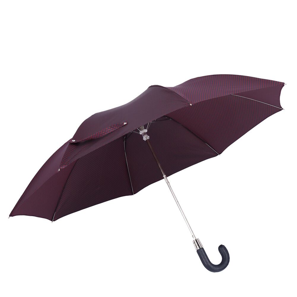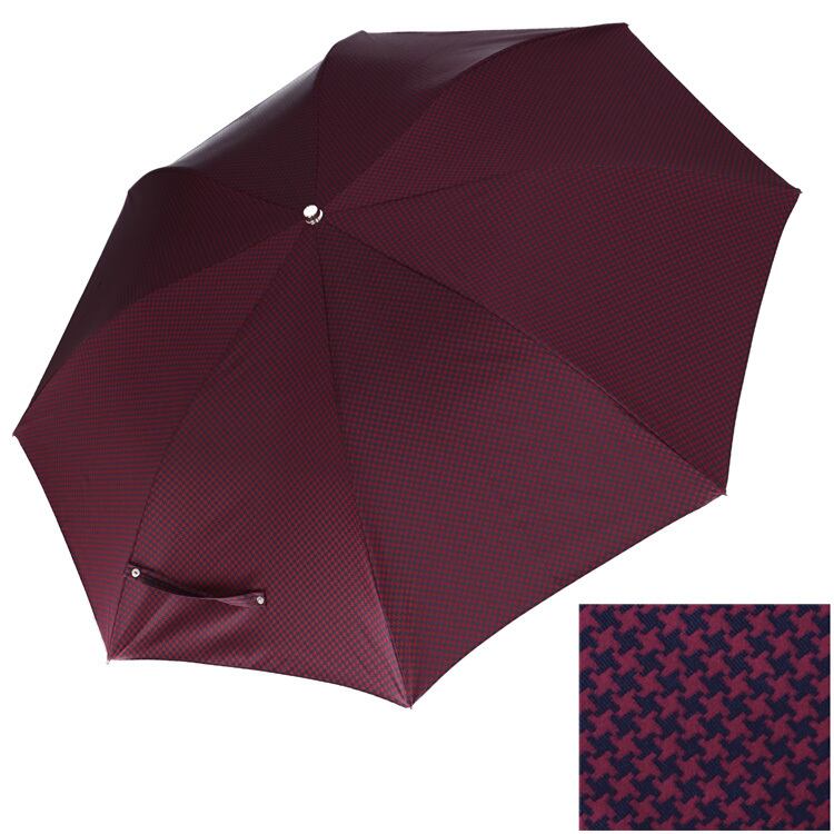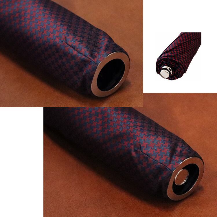 豊富なデザイン、スタイル、ハンドルのコレクションを誇る、他に類を見ない「Pasotti」イタリア国内で製造された唯一無二の傑作。高級感ある質感と深みのある色合いをしたレザーハンドルが、傘全体の印象を洗練しています。レッド&ネイビー千鳥格子柄とマッチし、美しい傘となっております。プッシュで開け閉めできるジャンプ傘ですがデザインを損なわないボタン。傘袋の底には穴が開いていて水抜きができ、見た目だけではない機能性を兼ね備えた紳士の高級傘です。