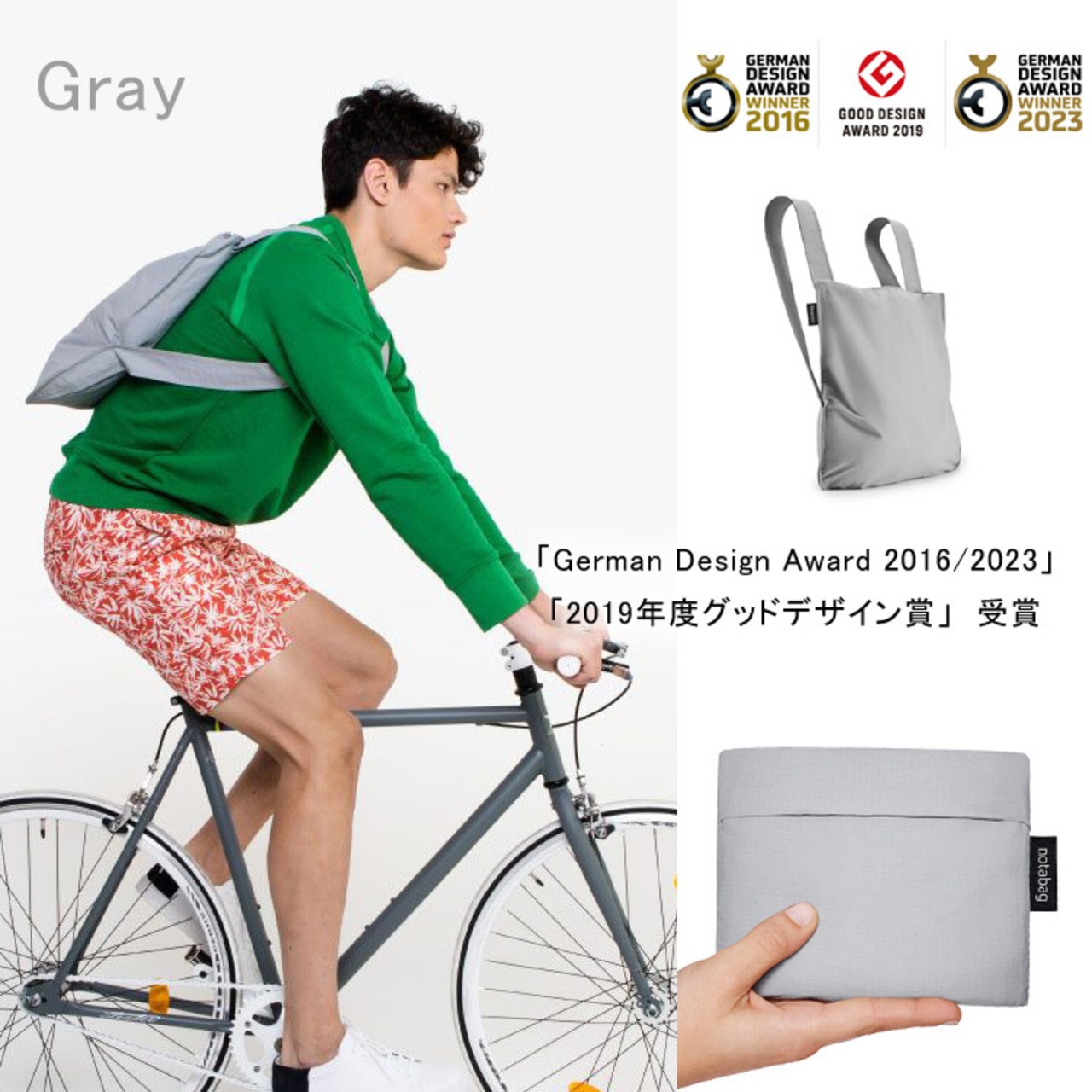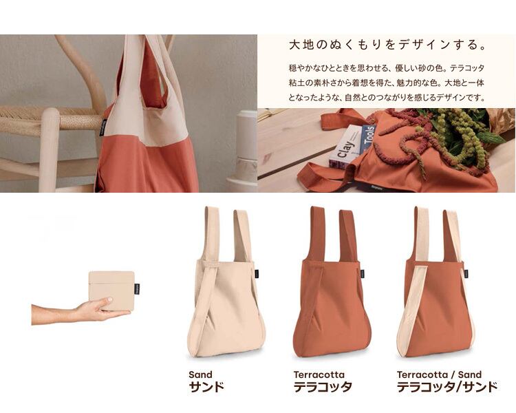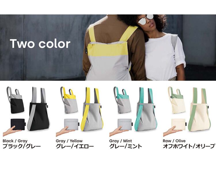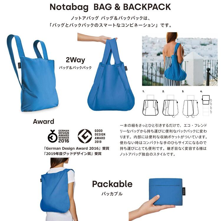 「2019年度グッドデザイン賞」受賞の「Notabag」の軽量2wayバッグ。『BAG&BACKPACK』はトートにもリュックサックにもなるカラフルでファッショナブルなポータブルバッグ。肩紐をさっとひと引きするだけで、トートバッグから持ち運びに便利なバックパックに変わります。世界的なデザイン賞『German Design Award』をExcellent Product Designで受賞。機能性の特許は登録共同体意匠(RCD)によって保護されています。