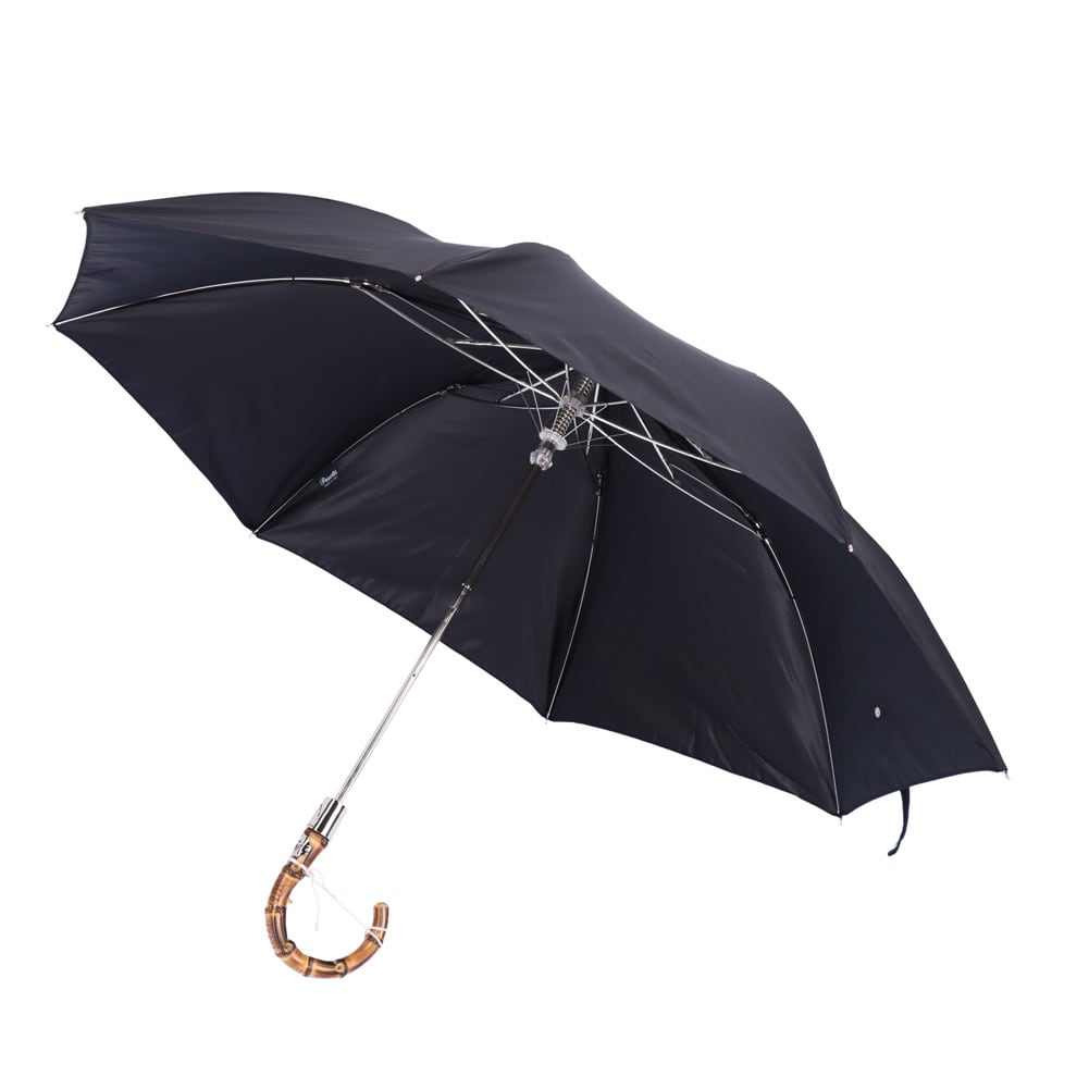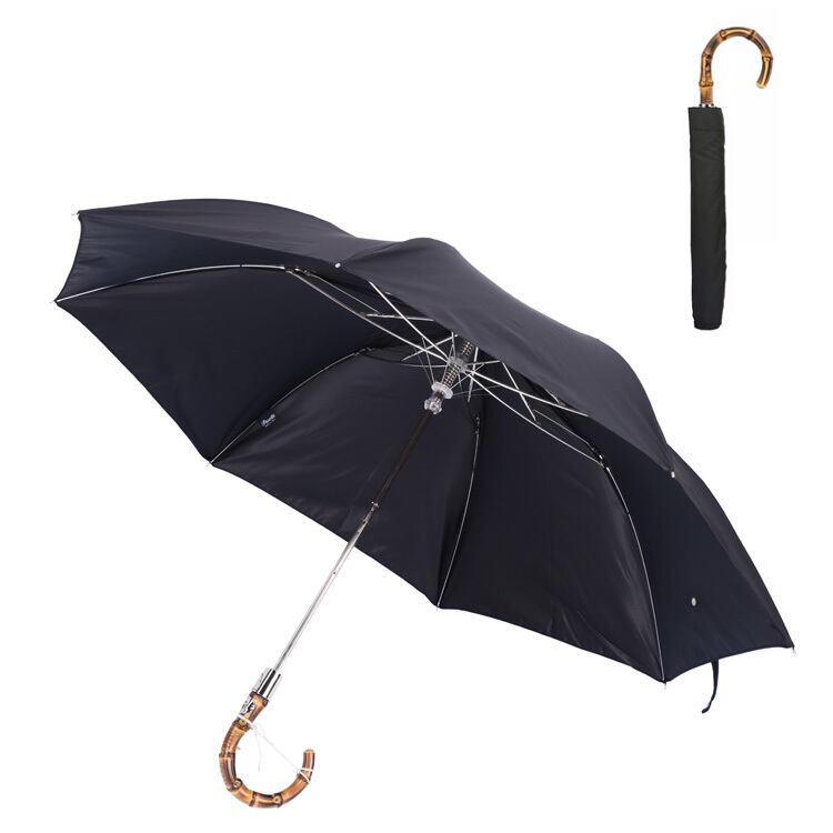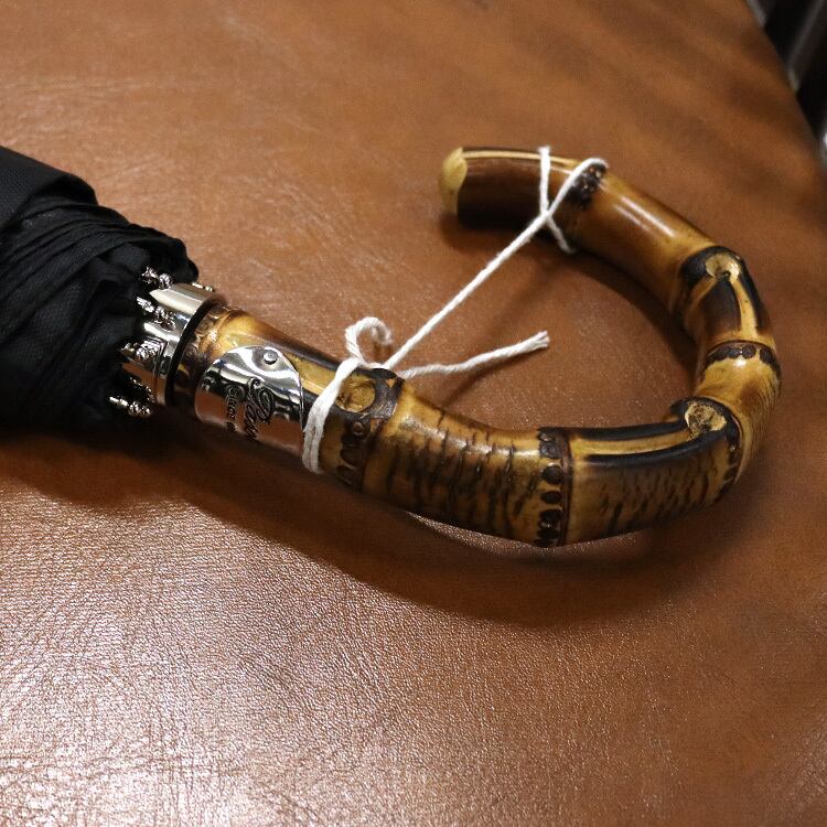 装身具としての傘。豊富なデザイン、スタイル、ハンドルのコレクションを誇る、他に類を見ない「Pasotti」イタリア国内で製造された唯一無二の傑作。高級感ある質感と深みのある色合いをしたバンブーハンドルが、傘全体の印象を洗練しています。シンプルな黒い無地とマッチし、美しい傘となっております。プッシュで開け閉めできるジャンプ傘ですがデザインを損なわないボタン。傘袋の底には穴が開いていて水抜きができ、見た目だけではない機能性を兼ね備えた紳士の高級傘です。