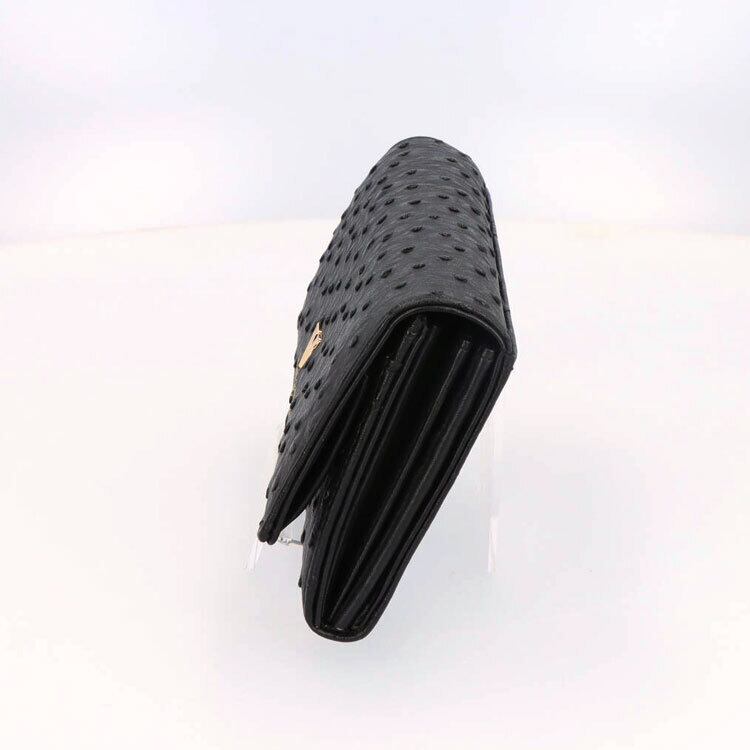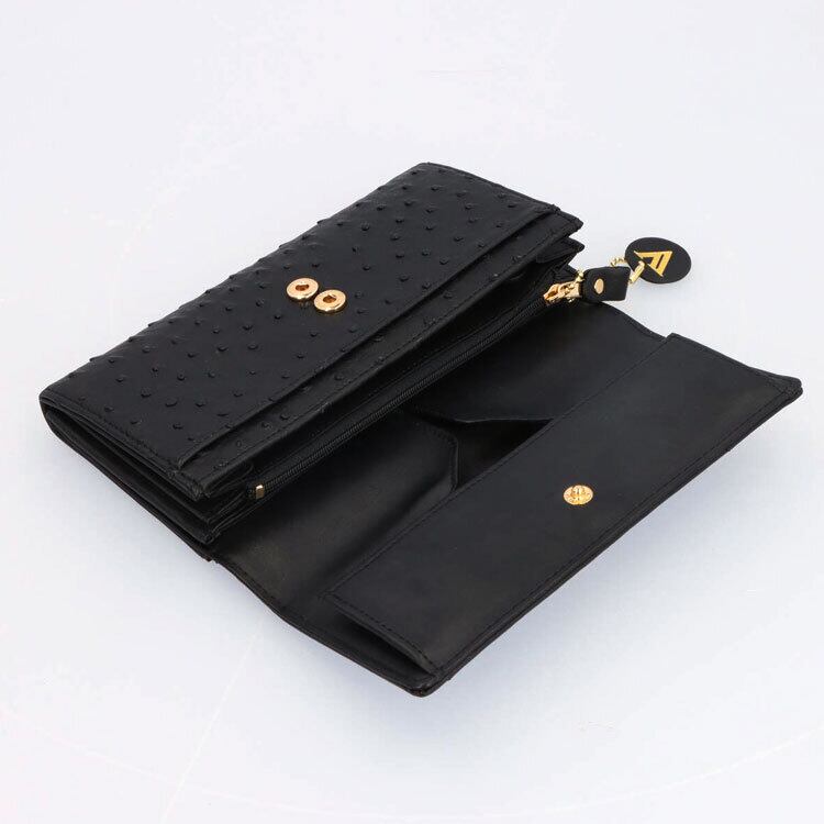 お札、小銭、カードを一度にたっぷり収納できるのが魅力のギャルソン長財布は小銭入れ部分がガバっと大きく開くので、小銭を見やすく取り出しやすいのが魅力。ポケットも豊富なので、お金やレシートを分けて収納でき財布の中はスッキリ。軽くてお手入れが簡単な合成皮革素材に、高級感あるオーストリッチ風型押しを施しました。シンプルなデザインなので、男性・女性共にご愛用頂け、贈り物としてもオススメです。