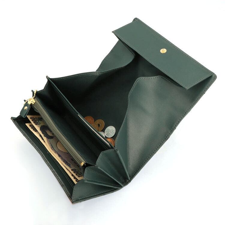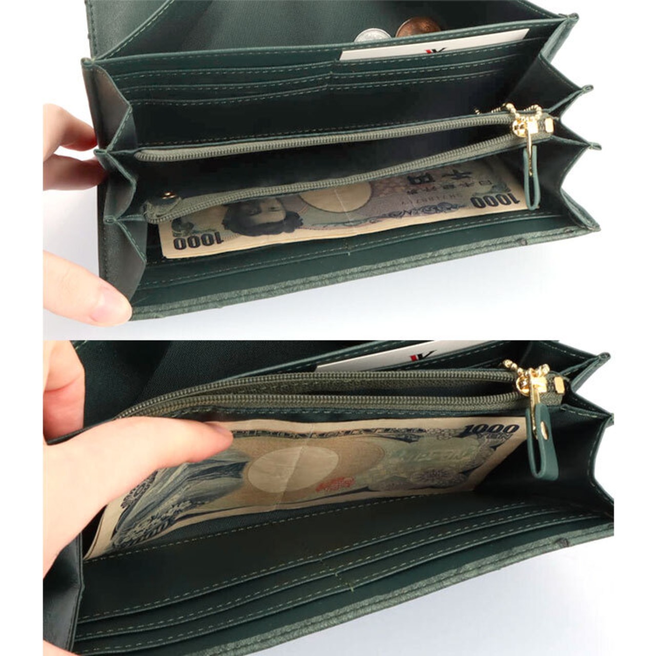 【サイズ(最大部を計測)】縦幅約10.5cm 横幅約19.5cm 厚み約4.5cm 【重さ】約210g 【内側収納】お札スペース×2、カードポケット×12、ギャルソン小銭入れ×1、オープンポケット×1、ファスナーポケット×1、キーチェーン付き 【外側収納】無し 【留め具】ボタン 【素材】合成皮革 【生産国】中国