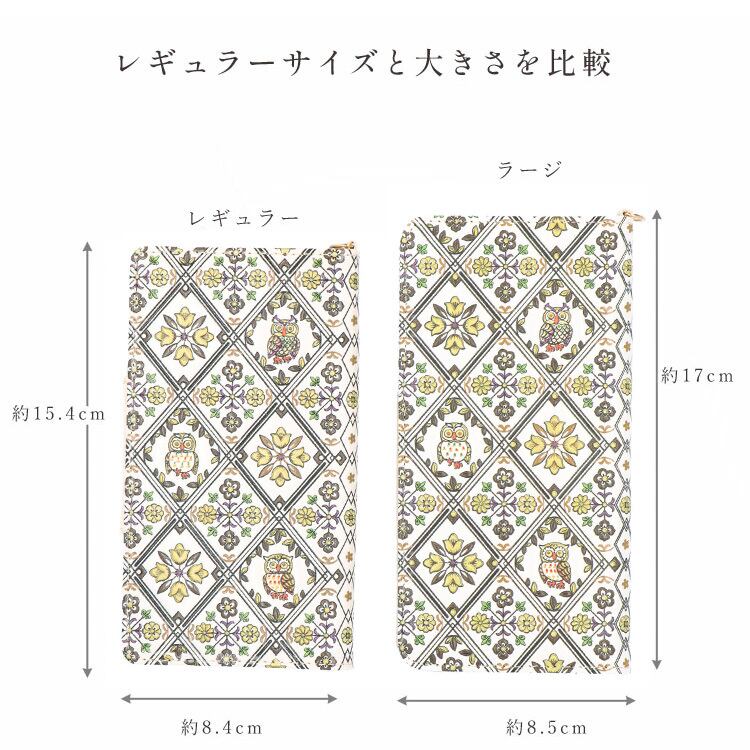【サイズ(最大部を計測)】縦幅約17cm 横幅約8.5cm 厚み約1.8cm、ふくろうチャーム根付長さ約10cm 【重さ】約80g 【内側収納】カードポケット×2 【外側収納】無し 【留め具】粘着パッド、吸盤(シリコン) 【素材】表地:文庫革(牛革) / 内側:ポリエステル / 粘着部:アクリル(土台:牛革) / 吸盤:シリコン 【生産国】日本