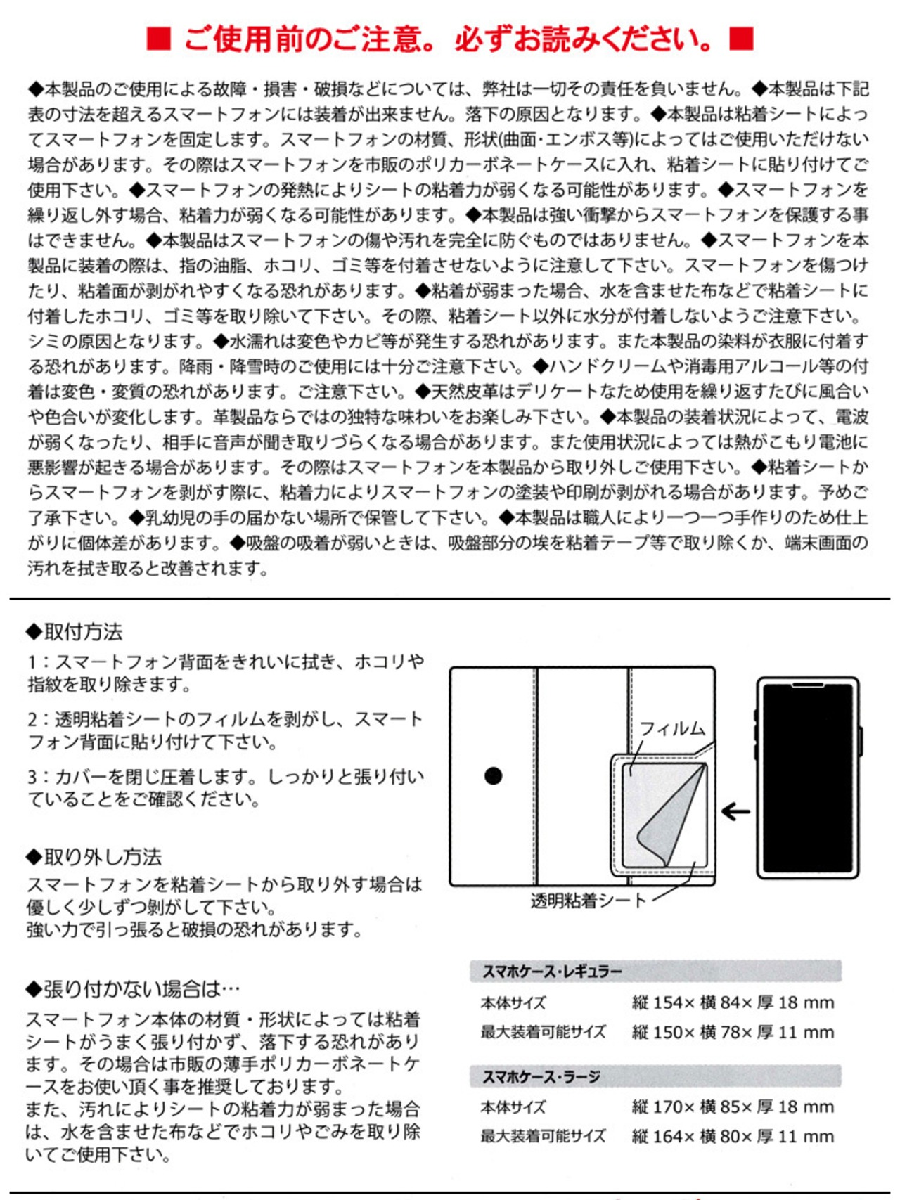 ※汚れ防止加工などのガラスコーティングやウレタン樹脂が施されたものやゴム素材の携帯端末には粘着シートが付着しません。付属の黒い粘着シートをご使用ください。