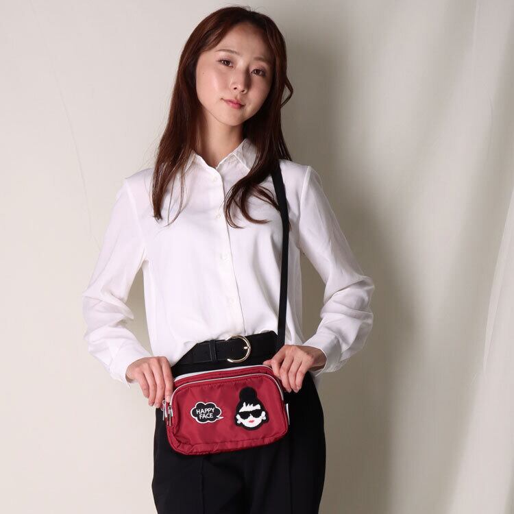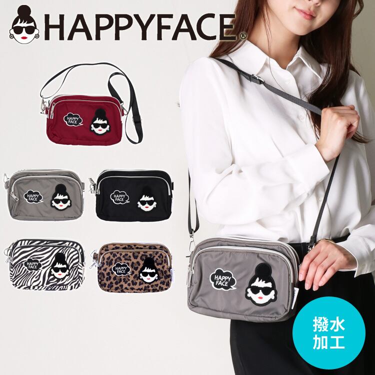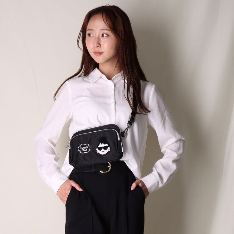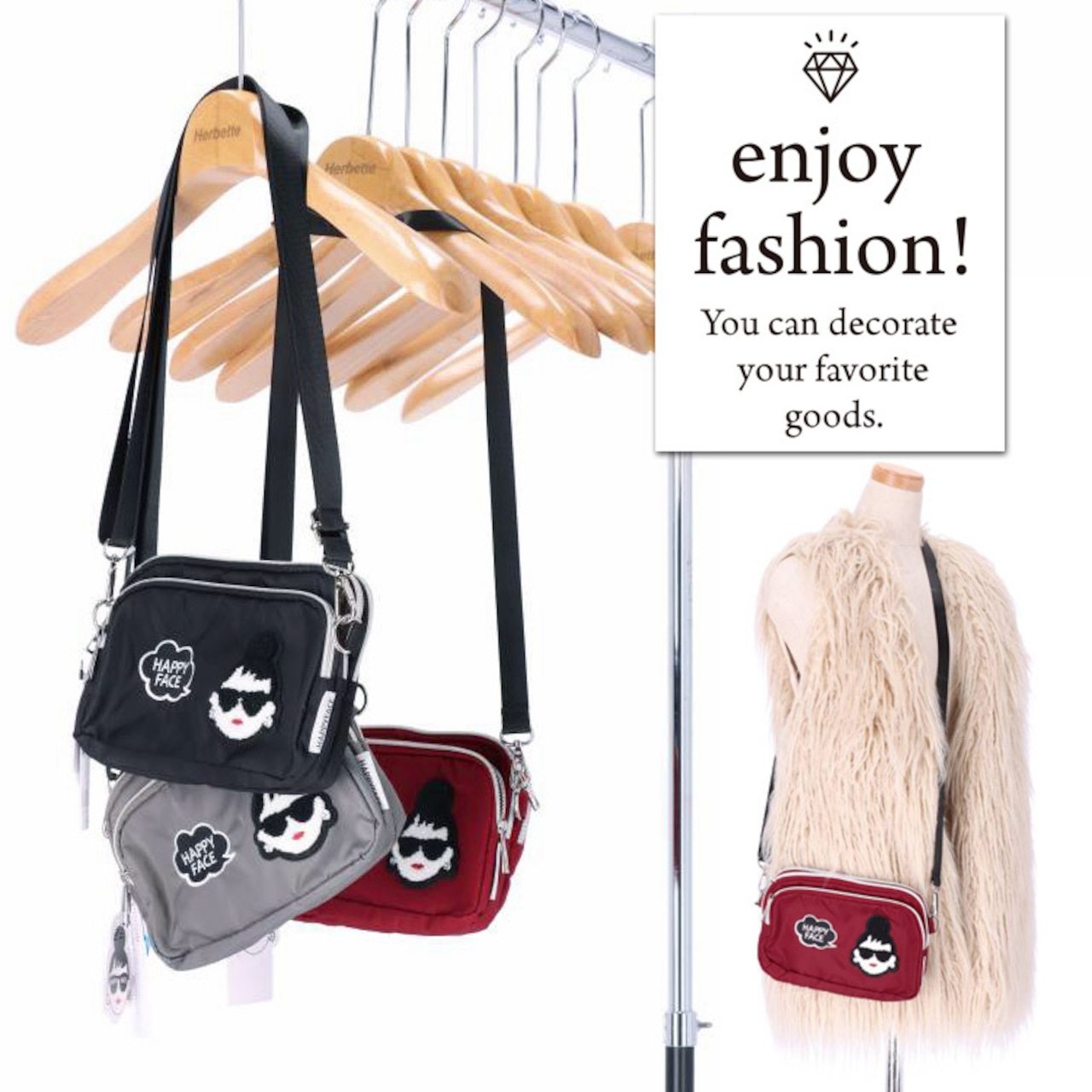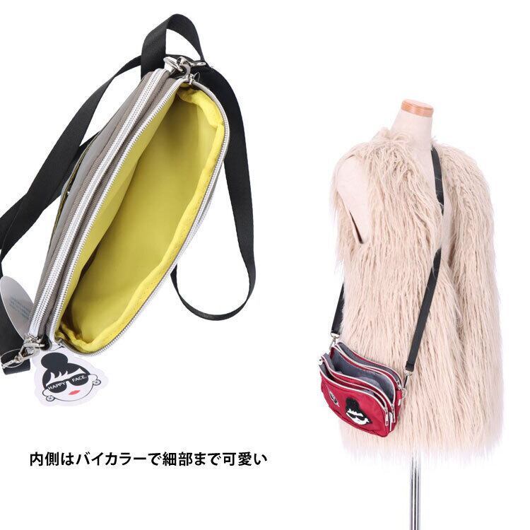 ラクジュアリーな世界に囲まれて暮らしたい…毎日を笑顔でエンジョイファッション!自分や友達へのスマイルグッズ Cute、Fancy、Sweetie「HAPPY FACE」の 「HAPPY FACE」の EMMA相良刺繍2way3室ショルダー/コーディネートのワンポイントになる個性的なアイテムです。旅行に最適なしっかり仕分けできる3室のミニショルダー。ゴージャスなEMMAのお顔が刺繍アクセントに。とっても軽くショルダーベルトは取り外し可能。撥水加工済なので水を弾き多少の雨でも安心(防水ではございません)。細部までこだわったバイカラーの裏地は見えても可愛い。今話題の女性のハッピーフェイスは女性への贈り物にもオススメです。