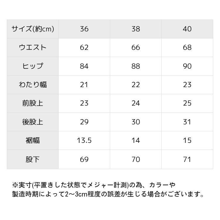 【40】ウエスト約68cm ヒップ約90cm わたり幅約23cm 前股上約25cm 後股上約31cm 裾幅約15cm 股下約71cm