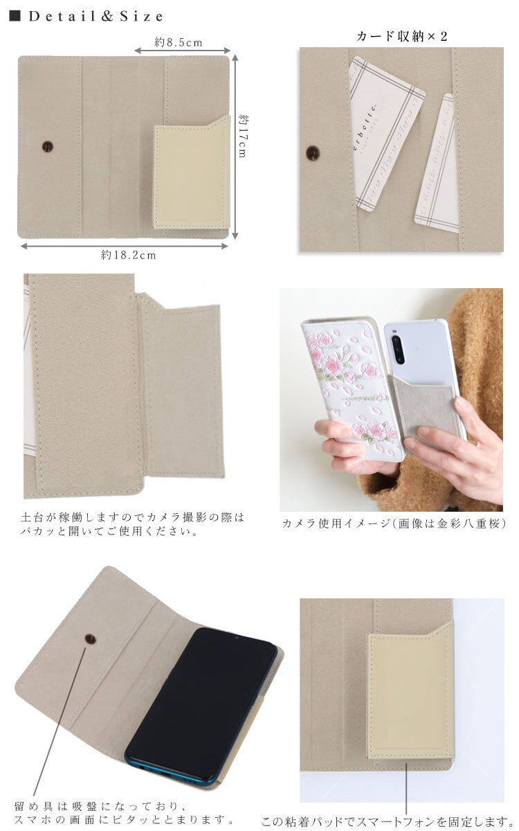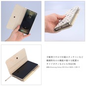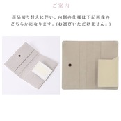 【サイズ(最大部を計測)】縦幅約17cm 横幅約8.5cm 厚み約1.8cm 【重さ】約80g 【内装】カードポケット×2 【留め具】粘着パッド、吸盤(シリコン) 【素材】表地:文庫革(牛革)、内側:ポリエステル、粘着部:アクリル(土台:牛革)、吸盤:シリコン 【付属】化粧箱付 【生産国】日本