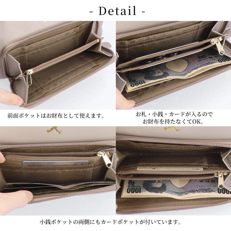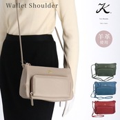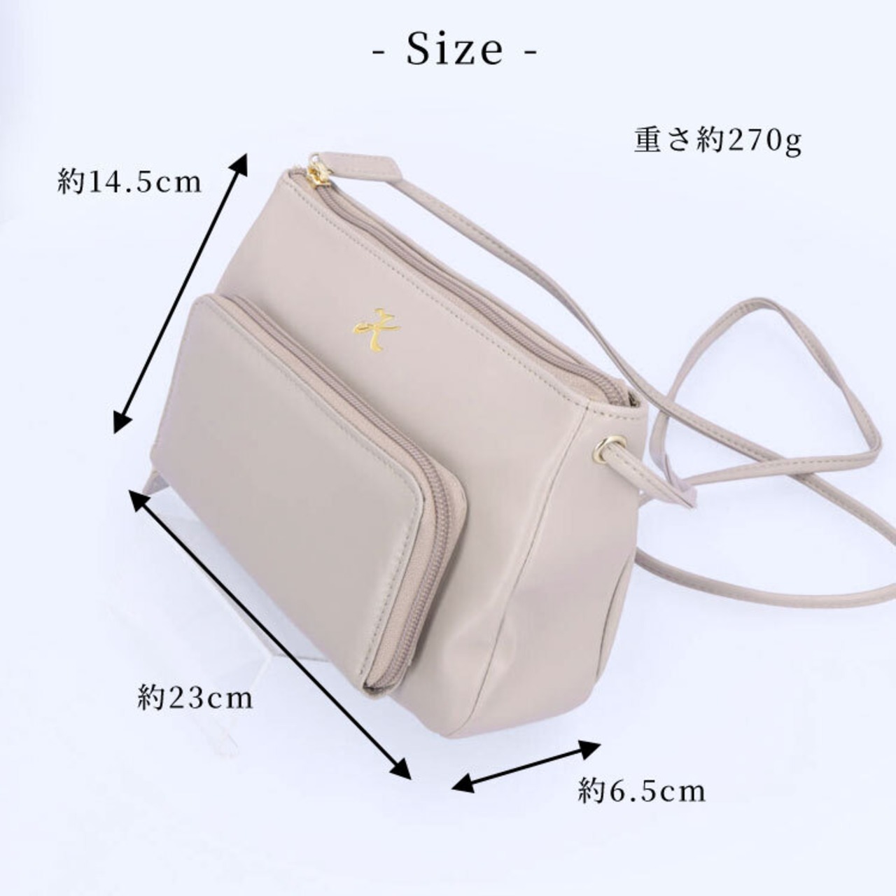 【サイズ(最大部を計測)】縦幅約14.5cm 横幅約23cm マチ幅約6.5cm ショルダー長さ約123cm 【重さ】約270g 【内側収納】本体:オープンポケット×2 お財布ポケット:カードポケット×8、小銭入れ×1、お札スペース×2、オープンポケット×2 【外側収納】ファスナーポケット×1、お財布ポケット×1 【留め具】ファスナー 【素材】お財布ポケット:羊革 本体、ショルダー:合成皮革 【生産国】中国