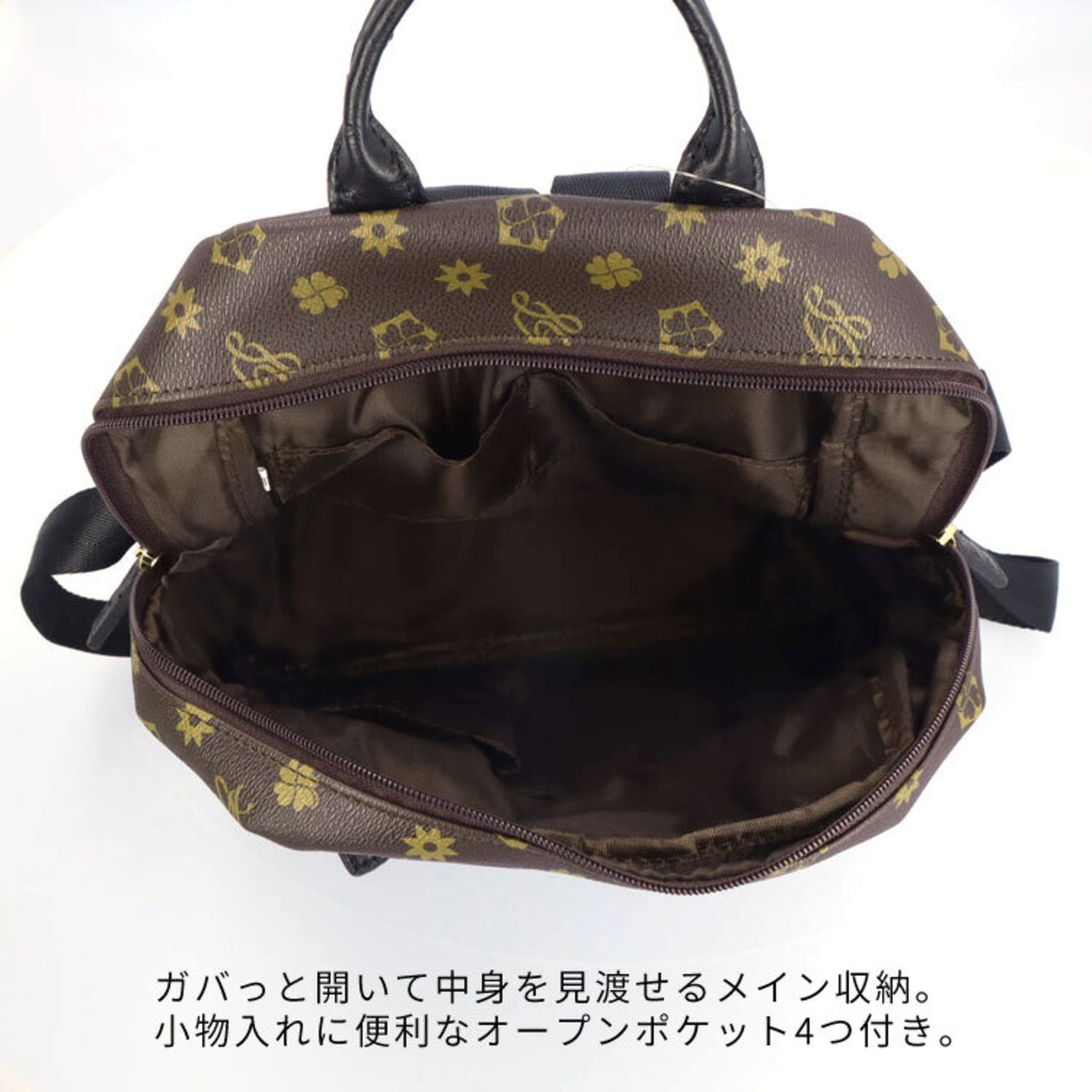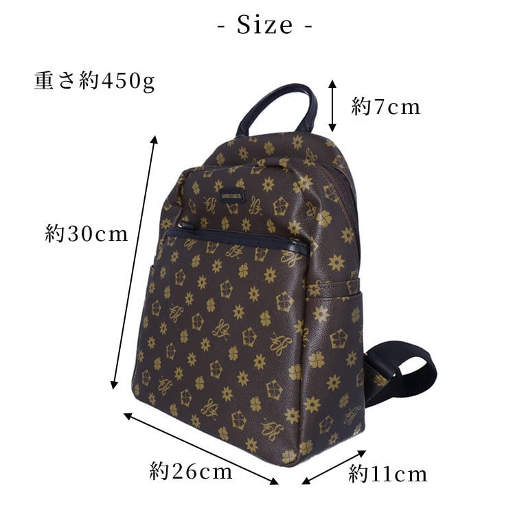 【サイズ(最大部を計測)】縦幅約30cm 横幅約26cm マチ約11cm 持ち手高さ約7cm 【重さ】約450g 【内側収納】オープンポケット×4 【外側収納】オープンポケット×2、ファスナーポケット×1 【留め具】ファスナー 【素材】合成皮革 【生産国】中国