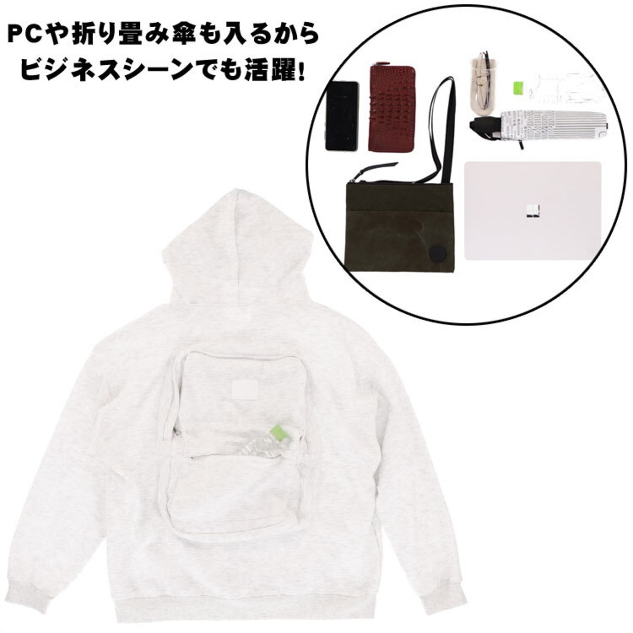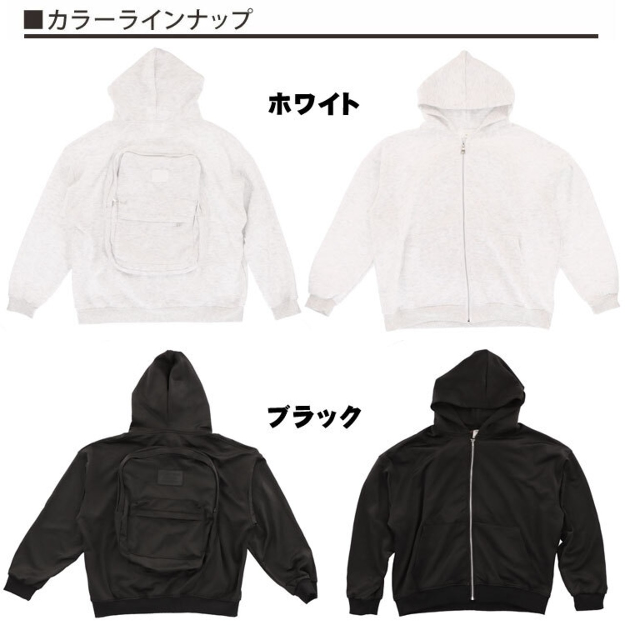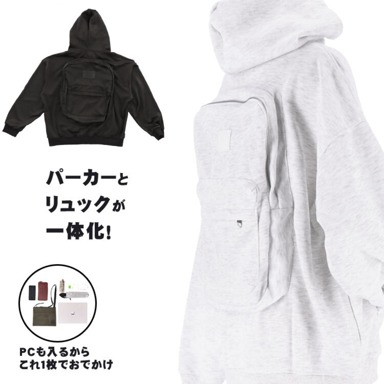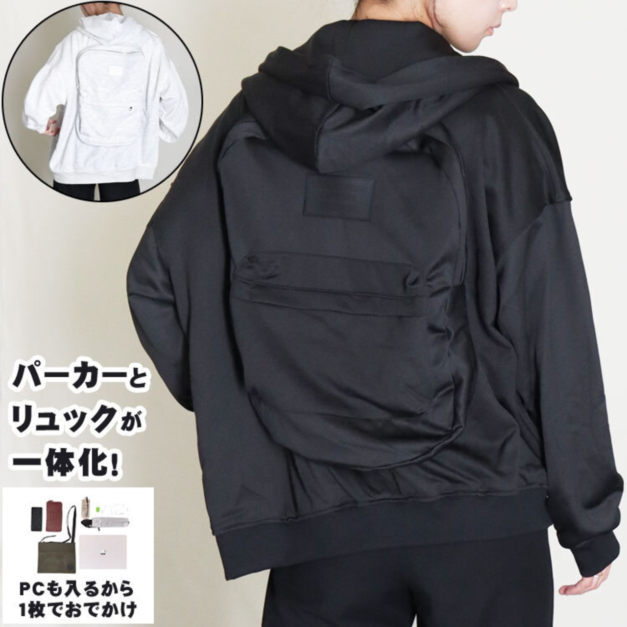 パーカー リュック フード 付き 新感覚 ホワイト ブラック メンズ レディース オーバーサイズ ドロップショルダー Mサイズ オシャレ リュックサック アウター 大容量 ビジネス 旅行 トラベル 手ぶら ユニセックス 送料無料 ギフト プレゼント