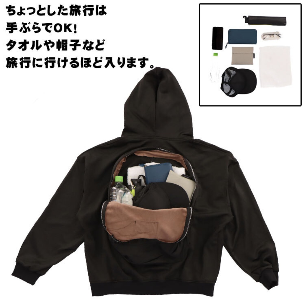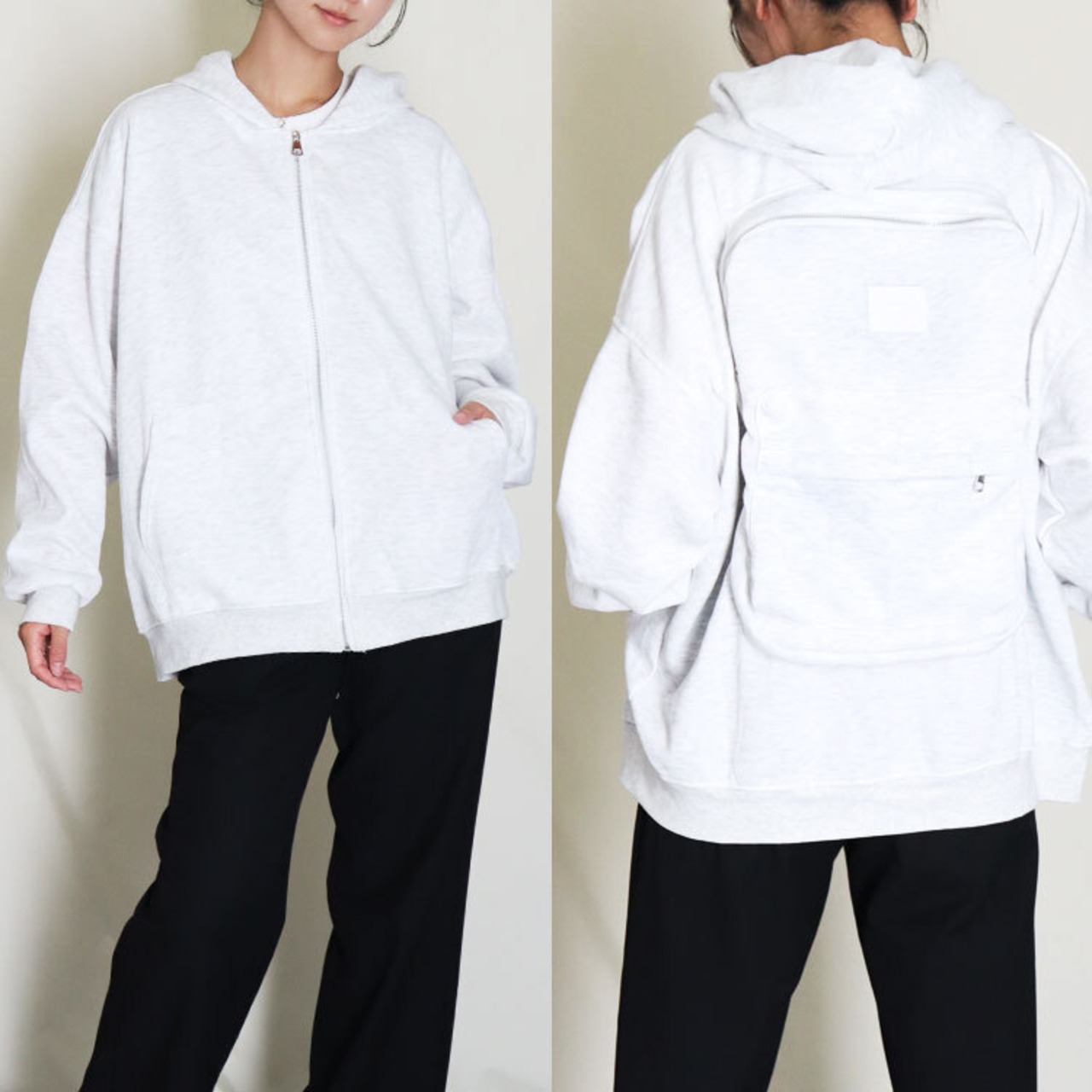 リュックとパーカーが一体化!?最先端の機能性デザインのアウターです。PCや折り畳み傘、タオルなどたくさん入るので、ビジネスシーンでも旅行でも大活躍。オシャレなオーバーサイズ風デザイン。いつでも手ぶらで、デイリーからお出かけまで幅広く活躍します。