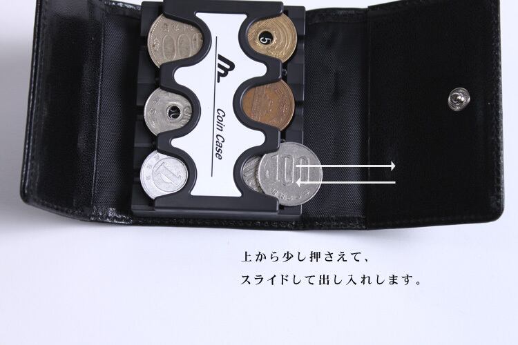 【サイズ(最大部を計測)】縦幅約6.5cm 横幅約8.5cm 厚み約2.5cm 【収納】コイン:500円,100円,50円,10円,5円,1円がそれぞれ5枚収納可能。/ フリーポケット×2 【重さ】約54g 【素材】カバー:合成皮革 本体:ABS バネ:SUS 【生産】日本