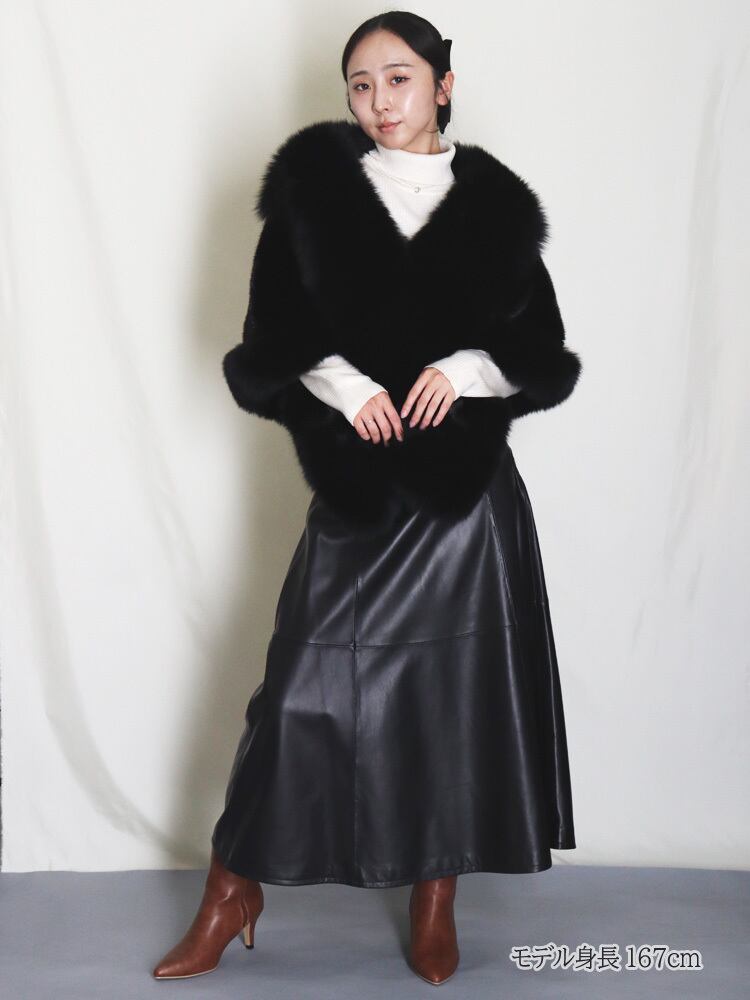 【サイズ(最大部を計測)】着丈約55cm 横幅約162cm 【重さ】約780g 【外側ポケット】2ヶ所 【内側ポケット】無し 【留め具】スナップ×1、ホック×1 【裏地】有り 【素材】ミンク、ブルーフォックス 【生産国】中国