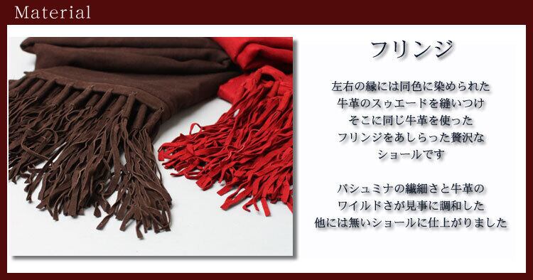 牛革のフリンジが印象的なパシュミナとシルクの大判ストールです。色鮮やかな発色と独特の柔らかさと軽さを持つ人気のパシュミナを横糸に。吸水性と発散性に優れたシルクを縦糸に使って織り上げているのでその肌ざわりは抜群です。左右には同色の牛革スウェードのフリンジ。ストール全体のアクセントになっています。大判サイズなので巻き方のアレンジも自由自在。大人っぽいエレガントな雰囲気を首元から演出してみましょう。