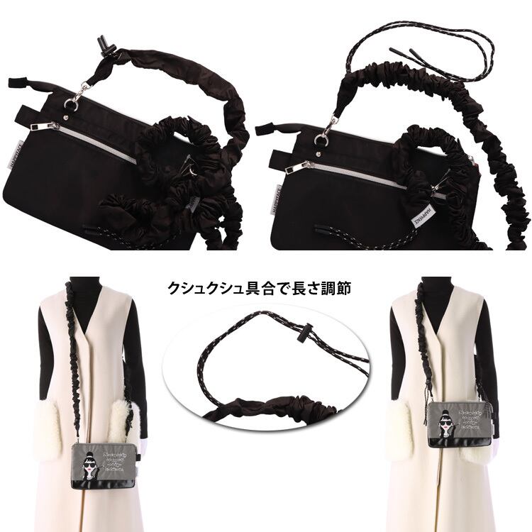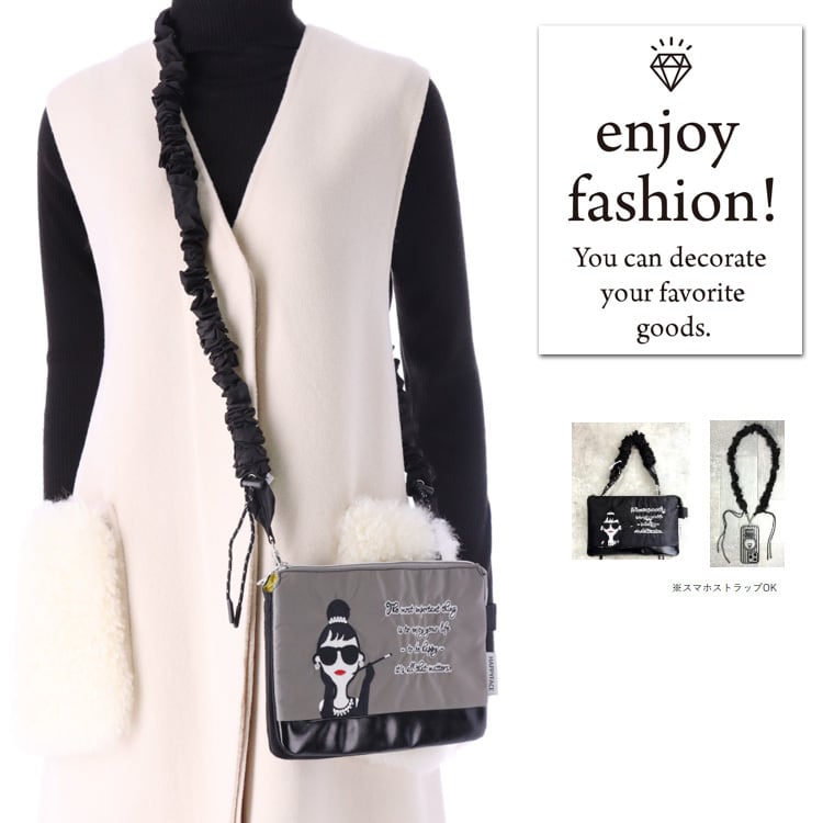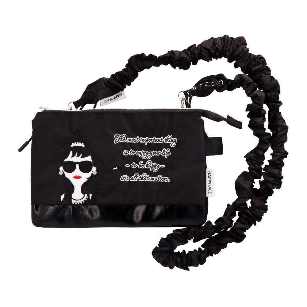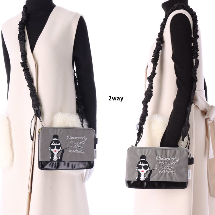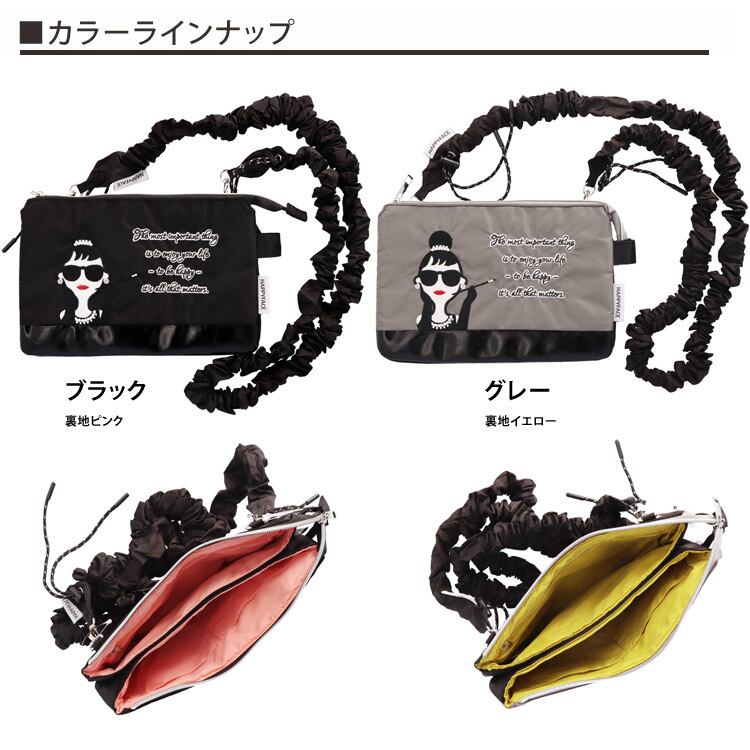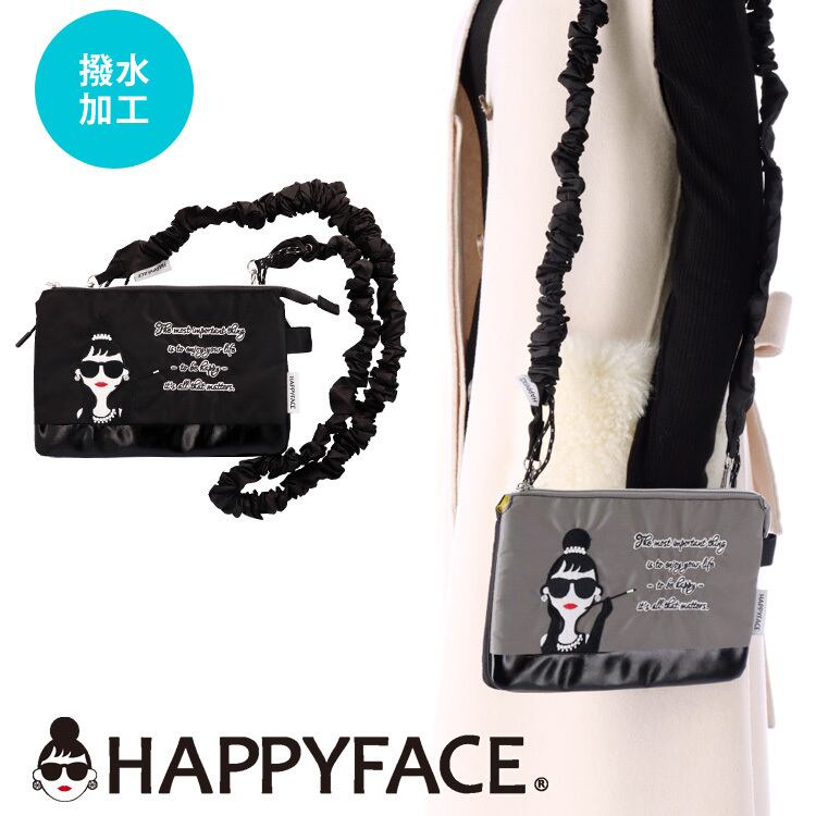 HAPPY FACE EMMA ショルダーバッグ クシュクシュ 刺繍 お顔 サングラス LADY 撥水加工 軽量 2wayショルダー スマホストラップ スマホショルダー バッグ ミニ 薄型 バイカラー レディース ギフト プレゼント 撥水 オシャレ かわいい 88036 ブラック グレー PV8836