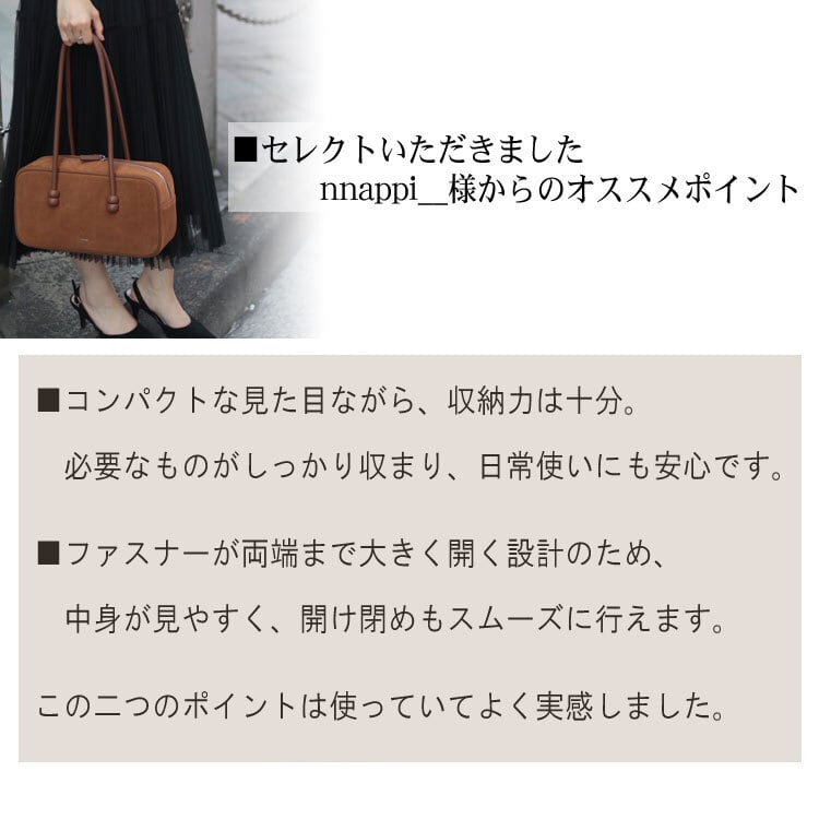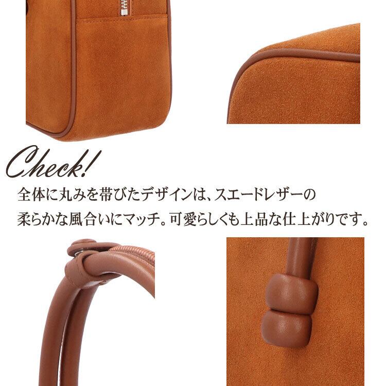 しっとりと起毛した本革スエードの表情と、丸みのある長方形デザインが可愛らしくも上品なバッグです。チューブ状のハンドルは本体とも馴染み長めのデザイン。持ち手の頂点部分には2本をまとめられるボタンがあり、肩掛けもしやすくなっています。マチは広く約10cm。自立でき、お財布・スマホ・お化粧ポーチなど、お出掛け用小物をしっかり収納可能。ファスナー開閉 + しなやかなレザーにより大きく開く口は取り出しやすく、内側のポケットも嬉しいポイント。柔らかな革の質感に、鮮やかなキャメルカラーが映え、コーディネートのアクセントにもなります。