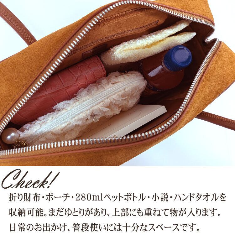 【サイズ(最大部を計測)】縦幅約16cm 横幅約30cm マチ幅約10cm ハンドル持ち上がり約22cm 【重さ】約580g 【内側収納】ファスナー付きポケット×1(横約17cm 縦約10cm)、オープンポケット×1(横約15cm 縦約7cm) 【外側収納】無し 【留め具】ファスナー・ハンドル留めボタン有り 【裏地】有り 【素材】表面:カウ(スエード加工)、持ち手:合成皮革、裏地:スエード調生地 【生産国】中国