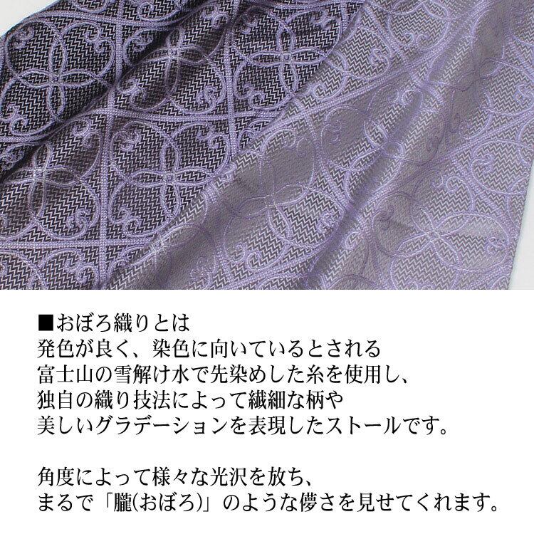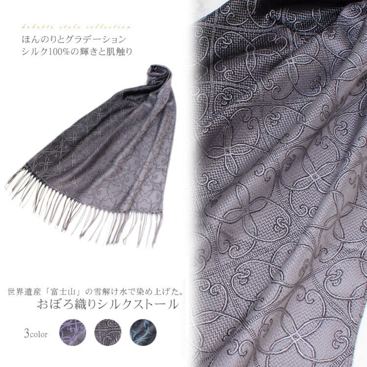 ストールって凡庸性が高く、いろいろなシーンで使いますよね!ちょっとしたお出かけで肩から羽織ったり、冠婚葬祭でドレスやワンピースに合わせたり。おぼろ織りの深みのある柄が大切なシーンを演出します。また、クーラーや朝晩の寒さ対策に使われるなら、肌触りの良い物がいいですね。そこで、シルク100%のおぼろ織りストールなのです。そのストールは富士山の麓、山梨県にありました。