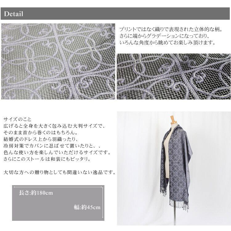 【サイズ(最大部を計測)】長さ約180cm + フリンジ約8cm×2(両サイド) 幅約45cm 【重さ】約120g 【留め具】無し 【裏地】無し 【素材】シルク100% 【生産国】日本 【お手入れ】石油系ドライクリーニング、低温アイロン(当て布)