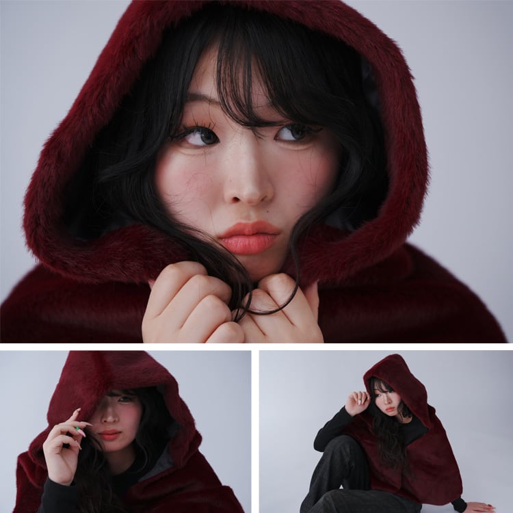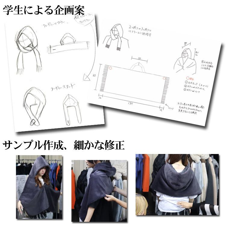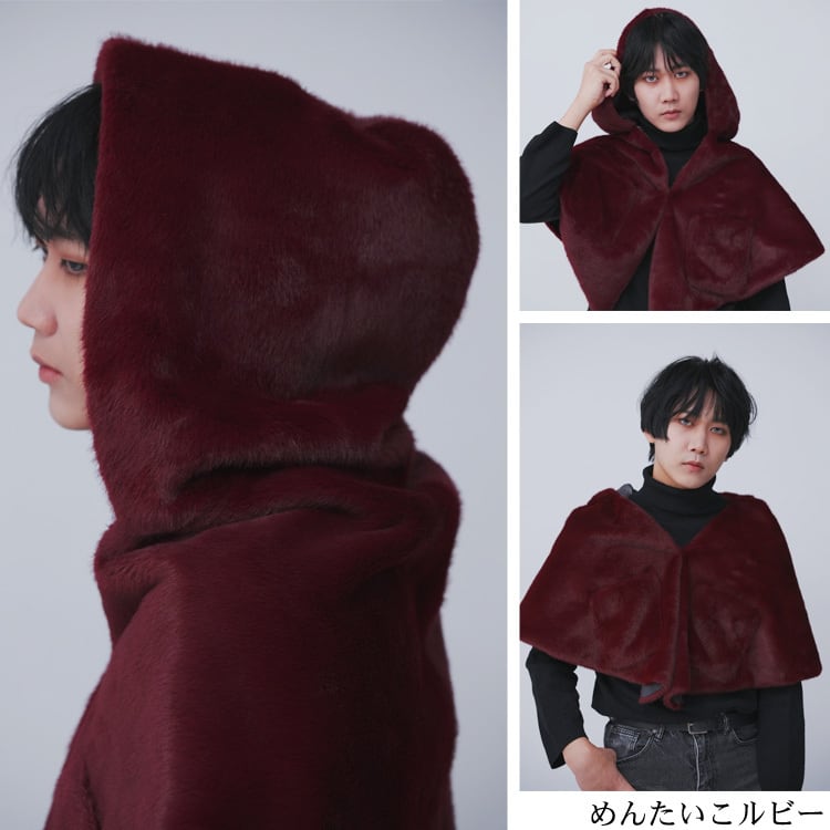 可愛らしく、カッコよくも決まるフードストール。フードをかぶった際のたるみや、ボタンを留めた際の曲線まで細かく調整し、ひざ掛けやブランケットとしても使える実用性も兼ね備えた、新時代のヘッドアイテム。デザインの最終調整ではポケットも追加し、細部までこだわり抜いた自信作です!カラーは合わせやすいグレーの「こんにゃくグレー」と、シックなワインレッドの「めんたいこルビー」をご用意。男女問わずお使いいただけるデザインに仕上げました。