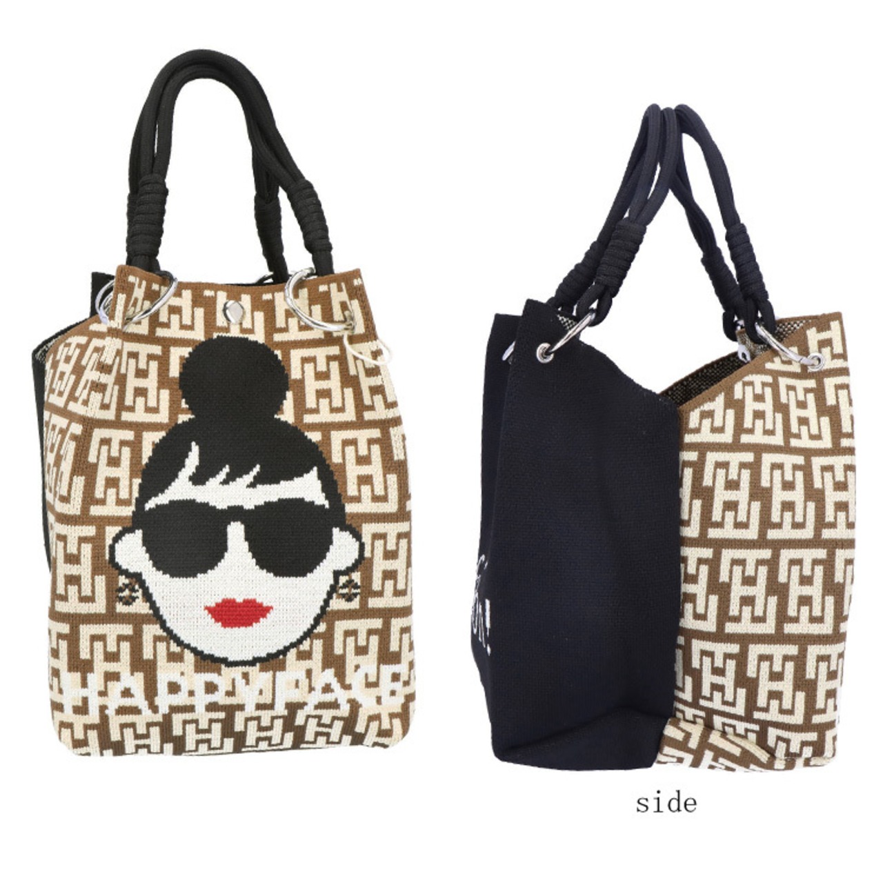 ラクジュアリーな世界に囲まれて暮らしたい…毎日を笑顔でエンジョイファッション!自分や友達へのスマイルグッズ Cute、Fancy、Sweetie「HAPPY FACE」の 大ヒット新作「ピコニット」モノグラム スクエアトートバッグ。コーディネートのワンポイントになる個性的なアイテムです。長財布やペットボトルも入るスクエアトートバッグ。EMMAのお顔とモノグラム柄、英字の両面どちらもオシャレで使いやすい。短めの持ち手までかわいいですが、お手持ちのショルダーベルトを付けることもできます。バイカラーで高見えし、しっかりとしたピコニットで機能性も◎。今話題の女性のハッピーフェイスは女性への贈り物にもオススメです。