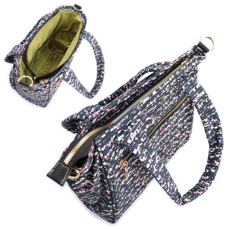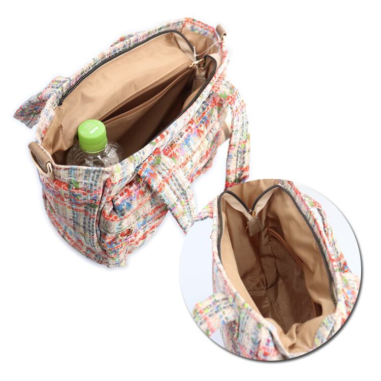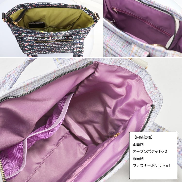 【サイズ(最大部を計測)】縦幅約25cm 横幅底約16.5cm・開口部35cm マチ約12.5cm 持ち手高さ約18cm ショルダーベルト約75-132cm 【重さ】本体のみ約340g 【内側収納】ファスナーポケット×1、メッシュオープンポケット×2 【外側収納】ファスナーポケット×1(中にオープンポケット×1)、ファスナーポケット×1 【留め具】ファスナー 【裏地】有り 【素材】ポリエステル、合皮 【生産国】中国