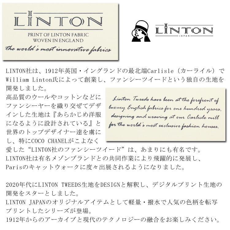 1920年代より最大の取引先となったココ・シャネルを始め、数多くのファッション デザイナー、著名メゾンブランドの愛したLINTON TWEEDS。2010年より正規輸入代理店 株式会社リントン ジャパン発足。LINTON JAPANオリジナルの撥水生地を使ったツイードプリントのバッグを開発。クラシカルなツイードプリントの2wayバッグ。とっても軽く、撥水性もあるので、デザインだけでなく機能性も抜群です。A4サイズやペットボトルも入るので、お出かけにビジネスに、小旅行まで対応。