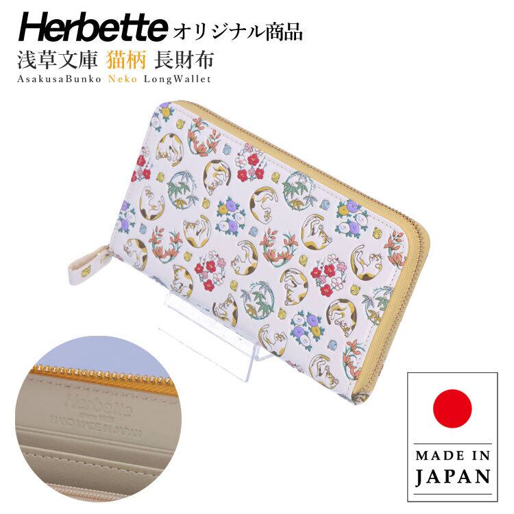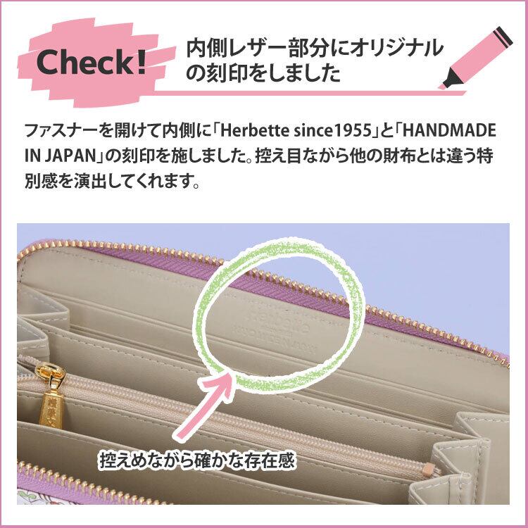 熟練の職人さんが、一枚一枚型押し、捺染作業をおこない、仕上げに筆で染色した革。その美しく贅沢な「浅草文庫革」を使用した長財布に、当店エルベートオリジナルデザインができました。ファスナー周りのカラーを「猫柄 三毛」に合わせた淡いイエローカラーに。500以上のカラーラインナップの中から選んだその色合いは表面の鮮やかさに馴染み、可愛らしさをより引き立てた配色になりました。金運アップのご利益があるとされる猫とイエローカラー。その効果を更にアップさせてくれるかも、知れません。更に内側には当店「エルベート(Herbette)」のブランドロゴを型押し。「HAND MADE IN JAPAN」の表記と共に、プレミア感のあるデザインになっています。