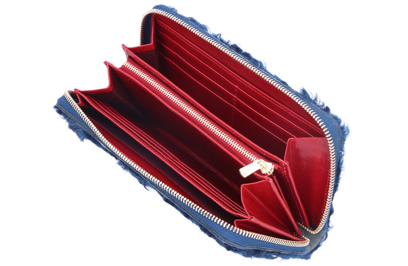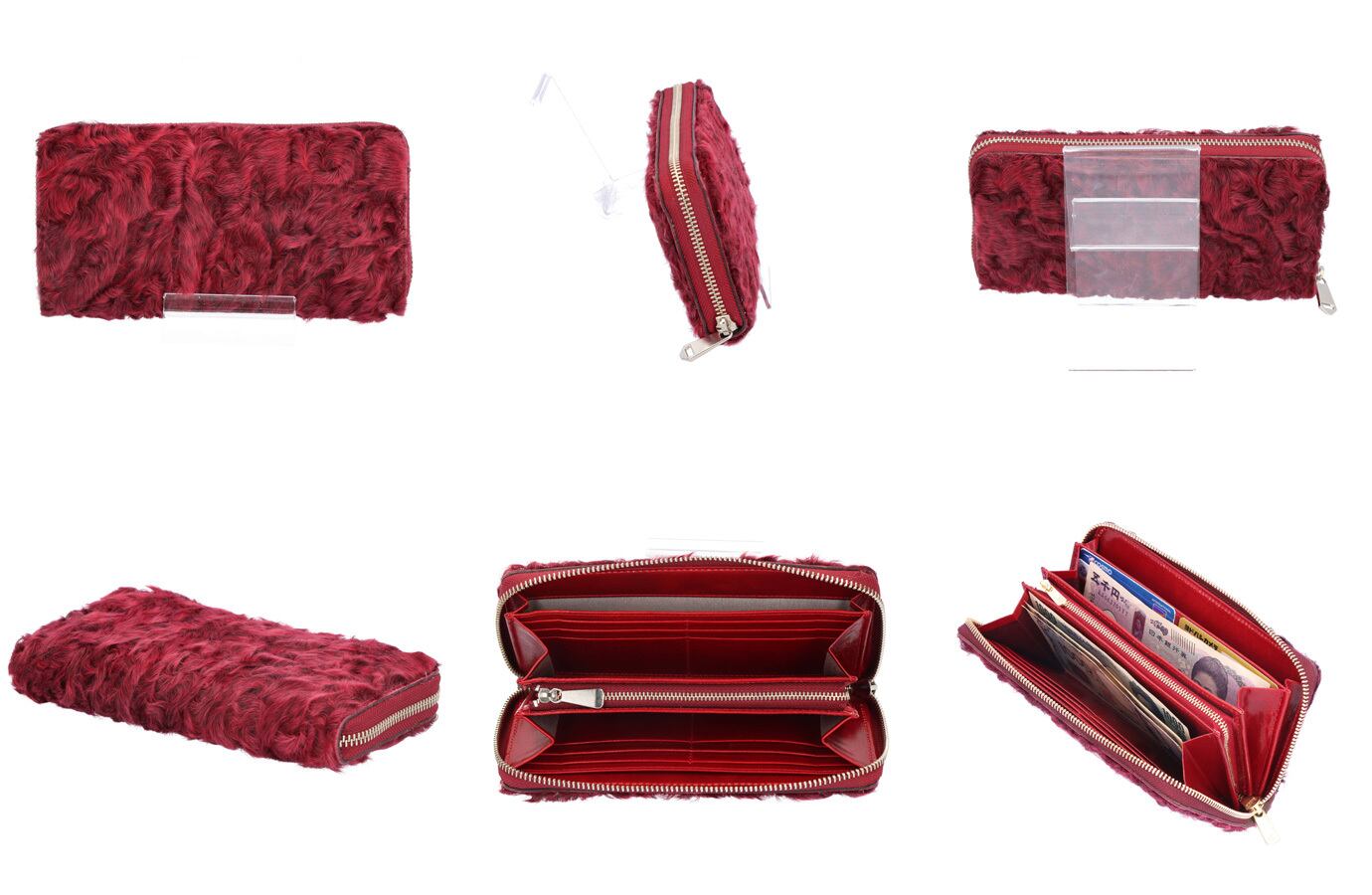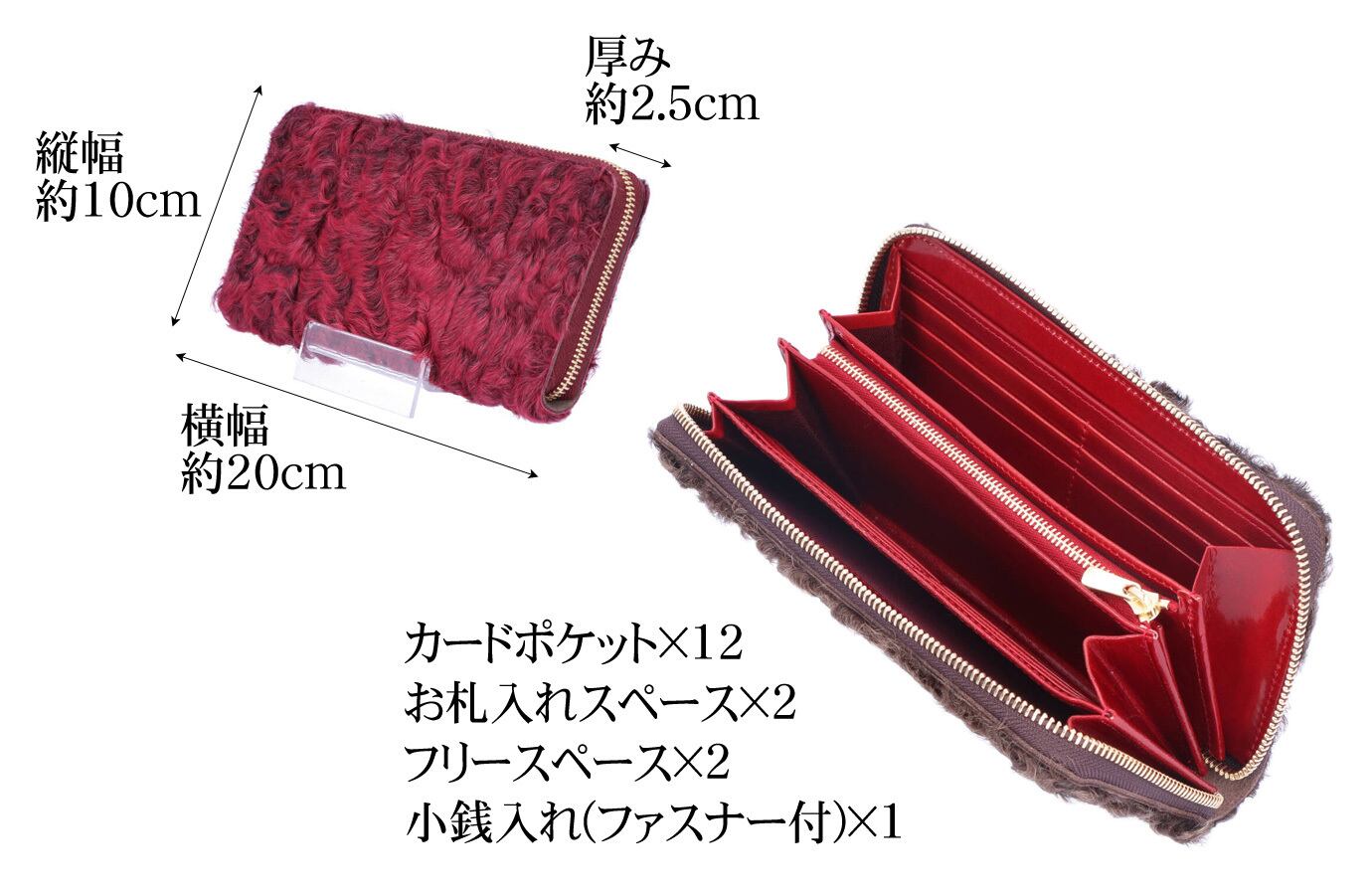 【サイズ(最大部を計測)】縦幅約10cm 横幅約20cm 厚み約2.5cm 【重さ】約240g 【内側収納】お札入れスペース×2、カードポケット×12、ファスナー式小銭入れ×1、オープンポケット×2 【外側収納】無し 【留め具】ファスナー(YKK製EXCELLA) 【素材】カラクルラム、イタリア製牛革 【生産国】日本