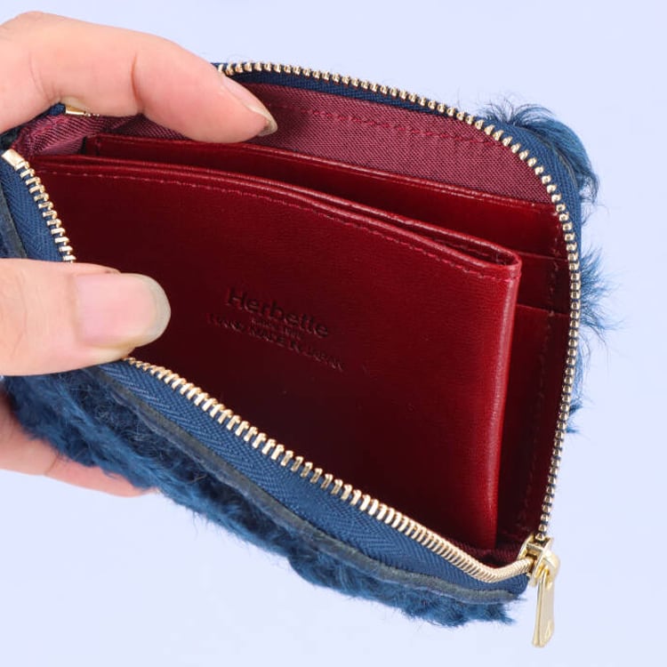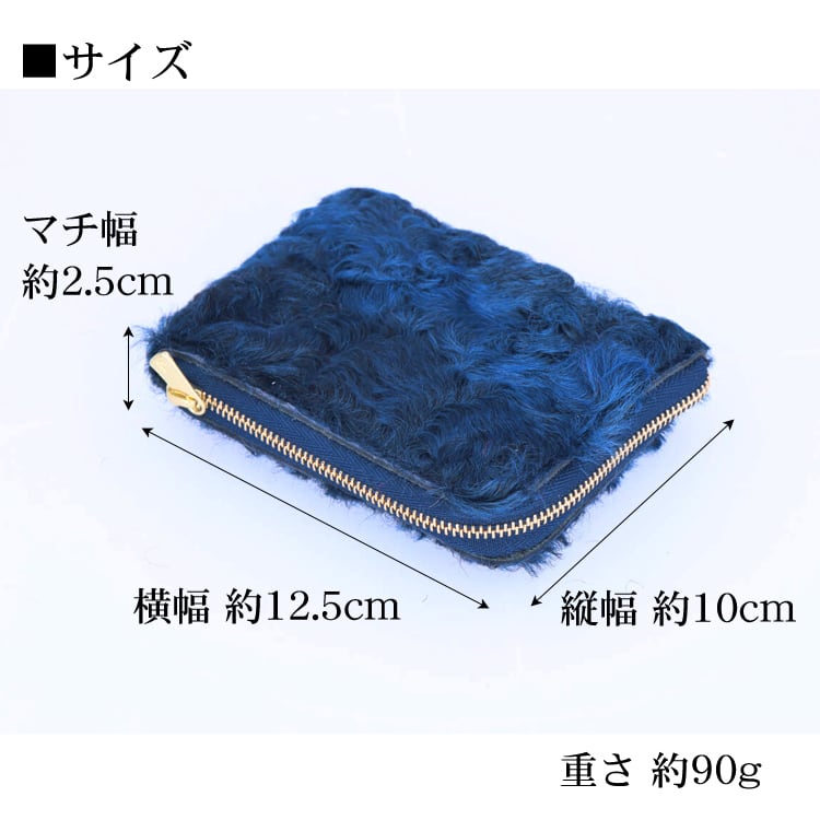 【サイズ(最大部を計測)】縦幅約10cm 横幅約12.5cm 厚み約2.5cm 【重さ】約90g 【内側収納】お札入れスペース×2、カードポケット×4、小銭入れポケット×1、オープンポケット×2 【外側収納】無し 【留め具】ファスナー(YKK製EXCELLA) 【素材】カラクルラム、イタリア製牛革 【生産国】日本