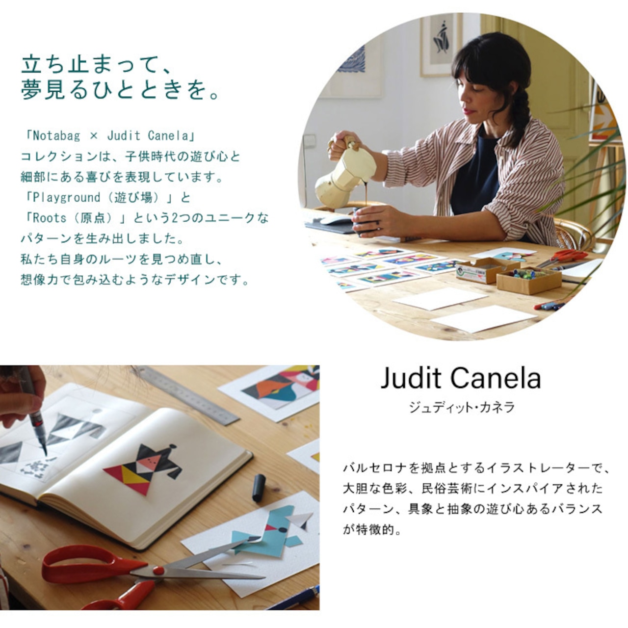 「Notabag × Judit Canela」コレクションは、子供時代の遊び心と細部にある喜びを表現しています。「Playground (遊び場) 」と「Roots (原点) 」という2つのユニークなパターンを生み出しました。