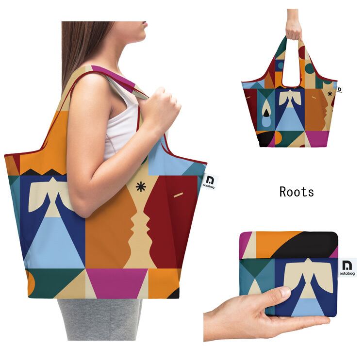 便利なオシャレアイテムとしてお楽しみいただけます。使わない時は収納ポケットにたたんで、コンパクトな手のひらサイズになるので持ち運びにとても便利です。バッグ内部には、財布や鍵を収納できる便利な収納ポケットがついています。ボタンや面ファスナーなどのパーツを全く使っていないので継ぎ目なく変容する様はノットアバッグ独自のスタイルです。「Notabag × Judit Canela」コレクションは、子供時代の遊び心と細部にある喜びを表現しています。「Playground (遊び場) 」と「Roots (原点) 」という2つのユニークなパターンを生み出しました。