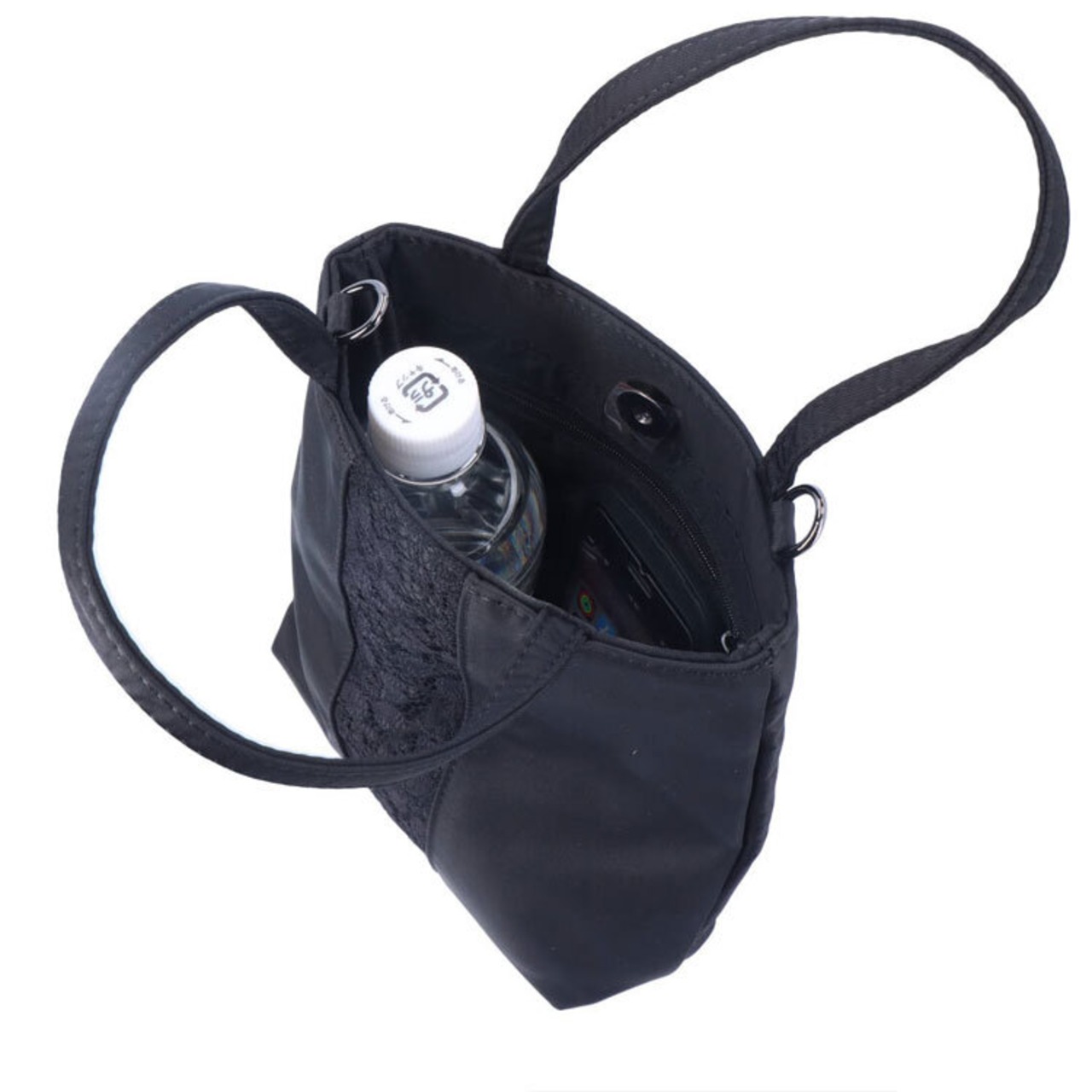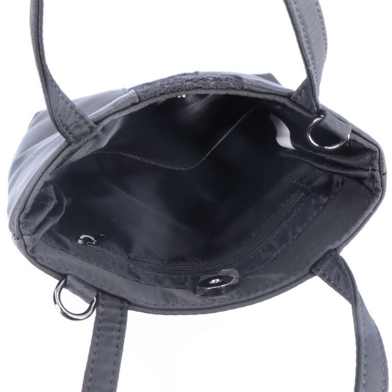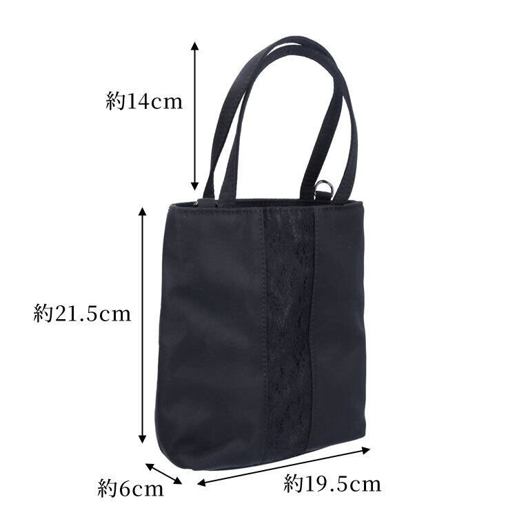 【サイズ(最大部を計測)】縦幅約21.5cm 横幅約19.5cm マチ幅約6cm 持ち手高さ約14cm 【重さ】約180g 【内側収納】オープンポケット×1、ファスナーポケット×1 【外側収納】無し 【留め具】マグネット 【素材】ポリエステル 【生産国】中国