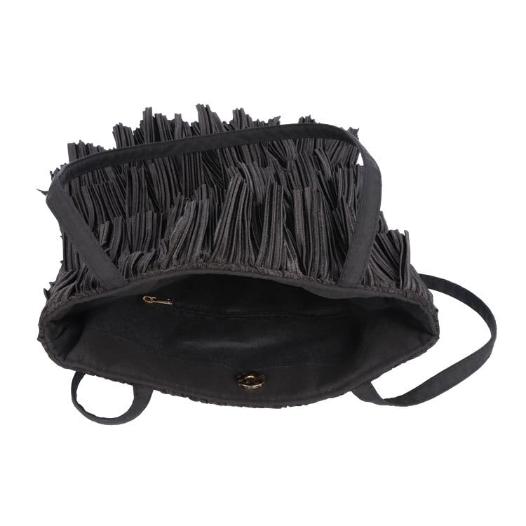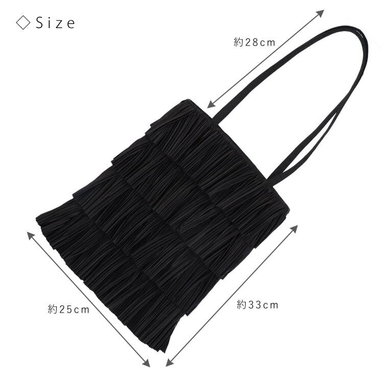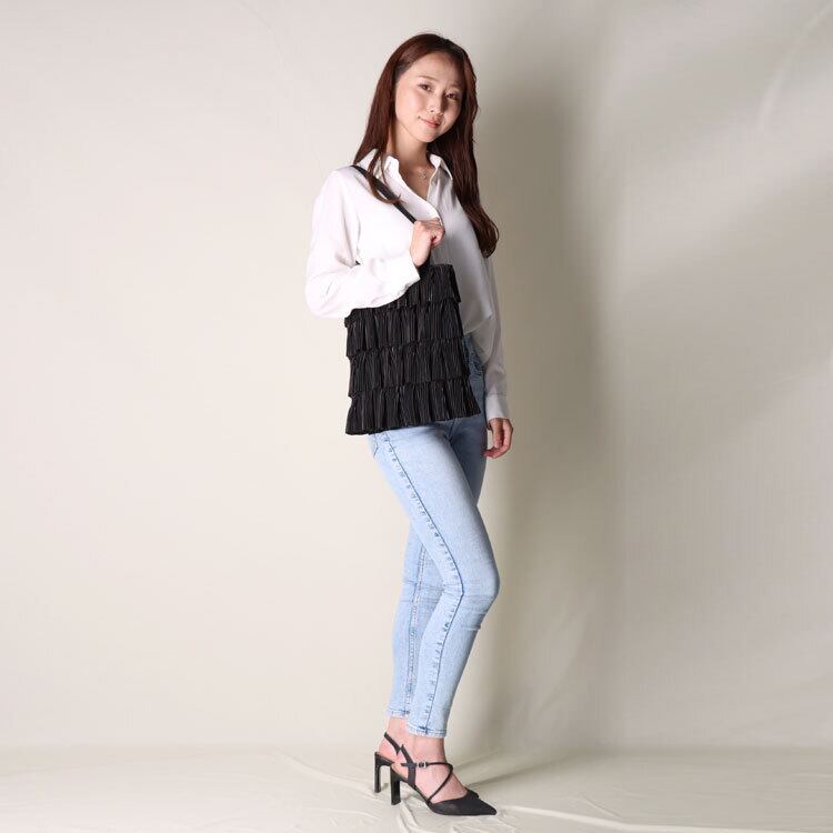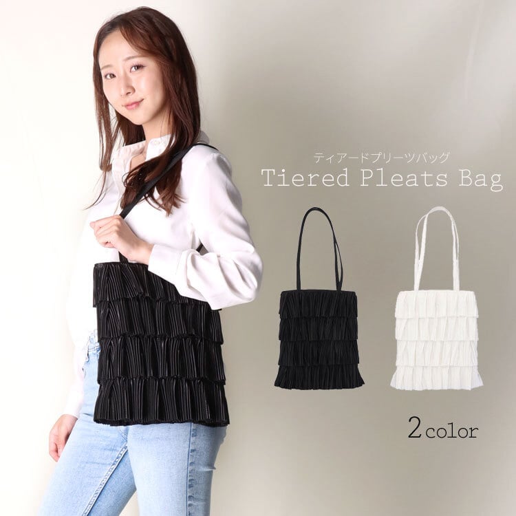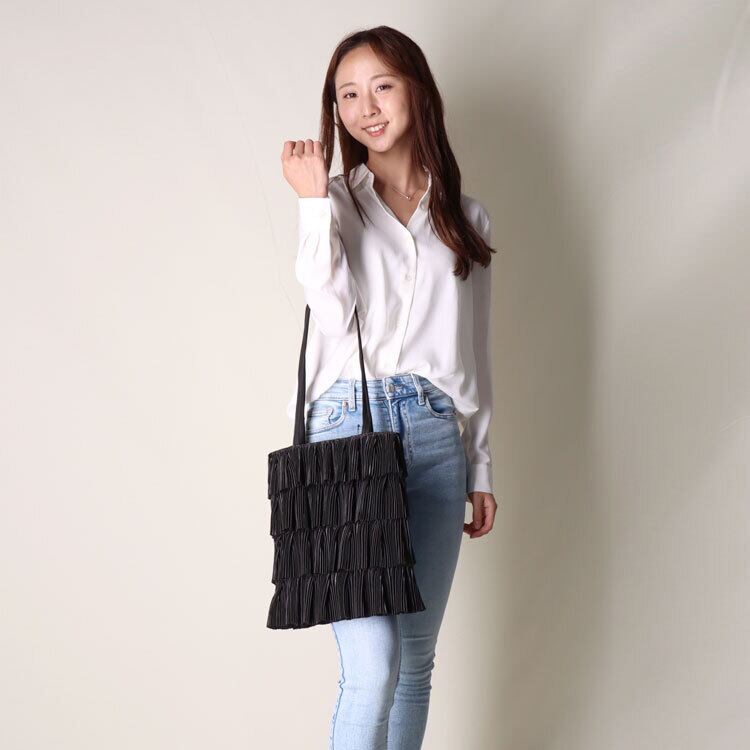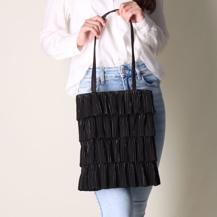ティアード(段々に重ねた)プリーツがフェミニンな雰囲気のバッグ。持ち手は十分な長さがあるので肩掛けOK。見た目以上の収納力で500mlペットボトルも入ります。縦型、スリムなマチなしでカジュアルからきれいめまで様々なスタイルにマッチします。