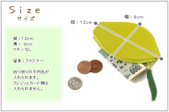 【サイズ(※最大部を計測)】縦幅約12cm 横幅約8cm マチ無し 【重さ】約25g 【留め具】ファスナー 【収納】四つ折の千円札が入れられます(三つ折りでは入りません)。クレジットカードサイズのものは入りません。 【素材】カーフレザー(牛革) 【生産国】タイ