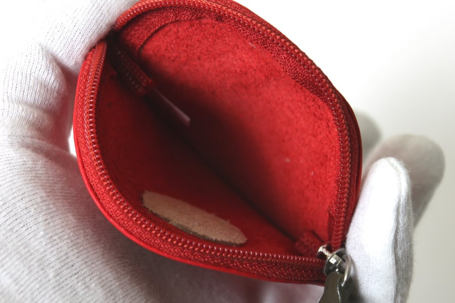 【サイズ(※最大部を計測)】縦幅(へた部分含まず)約8.5cm 横幅約9.5cm 厚み約1cm 【重さ】約20g 【留め具】ファスナー 【素材】カーフレザー(牛革) 【生産国】タイ