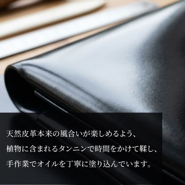 天然皮革本来の風合いが楽しめるオイルレザーの名刺入れです。ビジネスシーンに溶け込むシンプルなデザインで、スーツのポケットにも入れやすい薄マチ仕様です。名刺を分けて入れられるサブポケットも。オイルレザーとは、鞣した後でオイルをたっぷりと含ませた革の事。こちらはタンニン鞣しのヌメ革にオイルを手作業で丁寧に塗り込んでいるので、使い込むほどに深い味わいが出てきます。