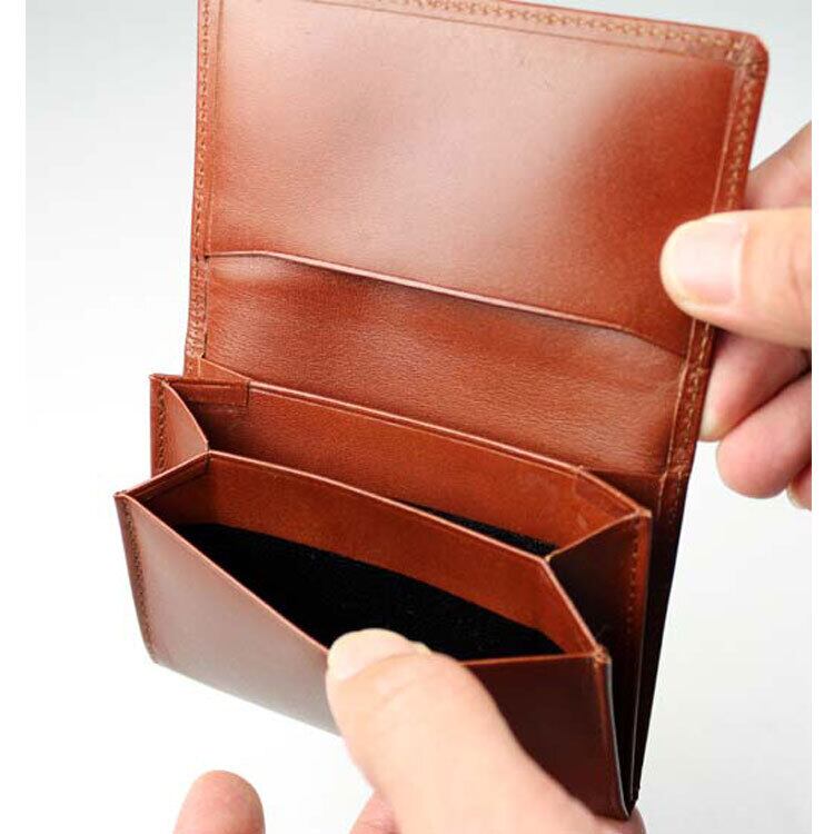 日本独自の技法・風琴マチを採用した本革名刺入れです。ビジネスシーンに溶け込むシンプルなデザインで、スーツのポケットにも入れやすい薄マチ仕様です。名刺を分けて入れられるサブポケットも。アコーディオンのようにマチが外側に折られている風琴マチ。内側に折られている通常のマチと異なり、出し入れ時に名刺が引っ掛かりにくく、厚みが出にくいのが特徴。風琴マチは工程が非常に複雑で高度な技術が必要なため、あまり見られない貴重な逸品となっております。