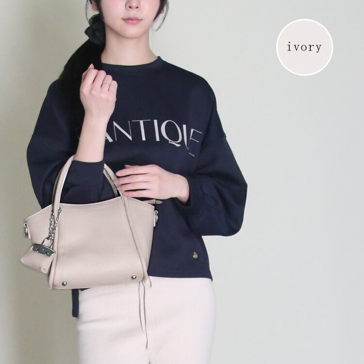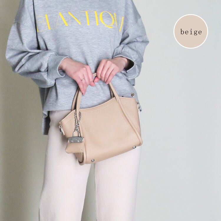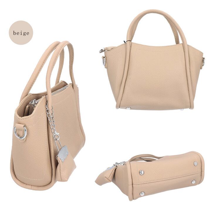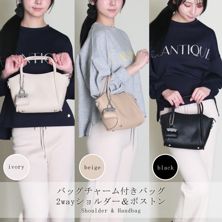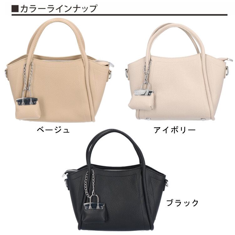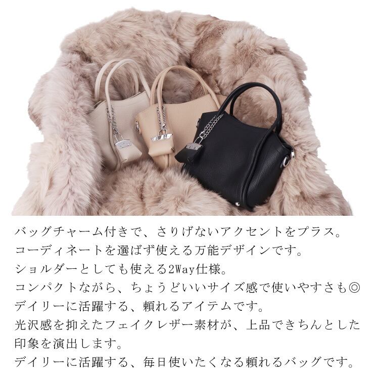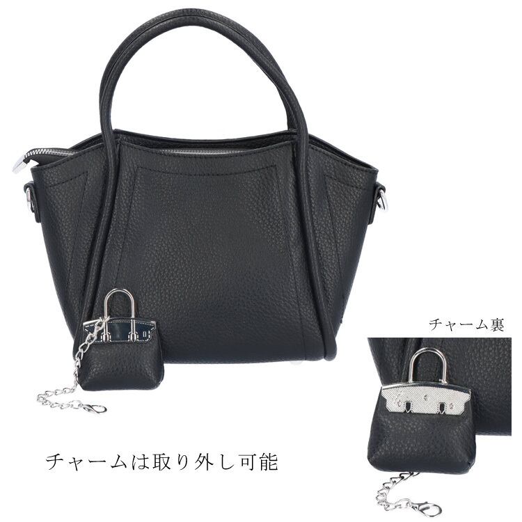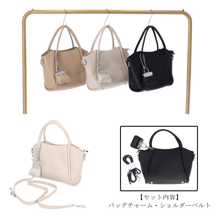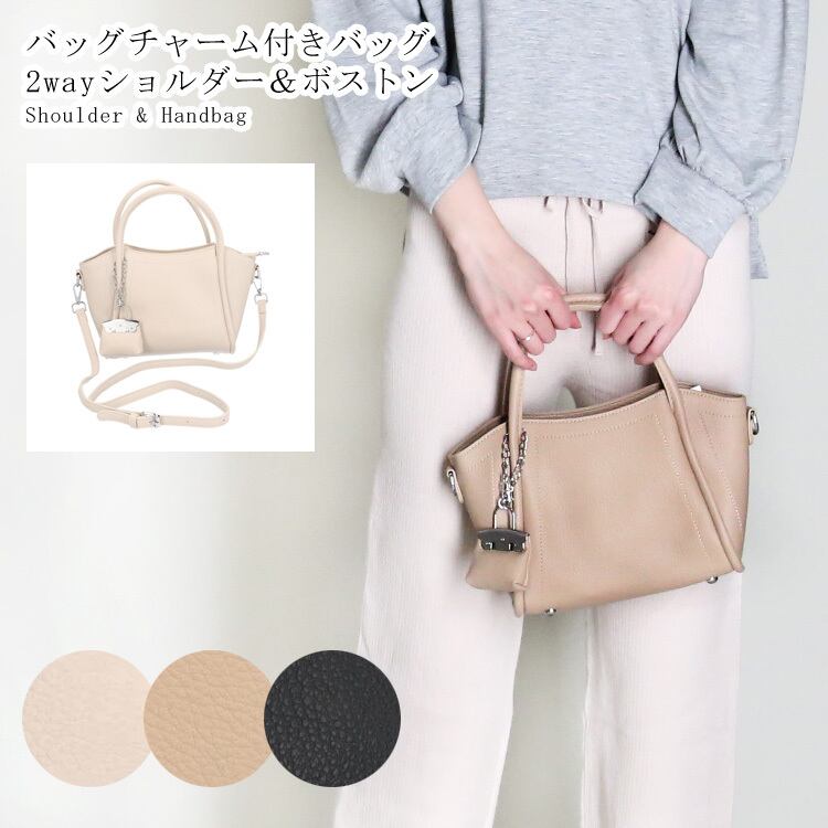 『バッグチャーム付きバッグ』バッグチャーム付きで、さりげないアクセントをプラス。コーディネートを選ばず使える万能デザインです。ショルダーとしても使える2Way仕様。コンパクトながら、ちょうどいいサイズ感で使いやすさも◎デイリーに活躍する、頼れるアイテムです。光沢感を抑えたフェイクレザー素材が、上品できちんとした印象を演出します。デイリーに活躍する、毎日使いたくなる頼れるバッグです。