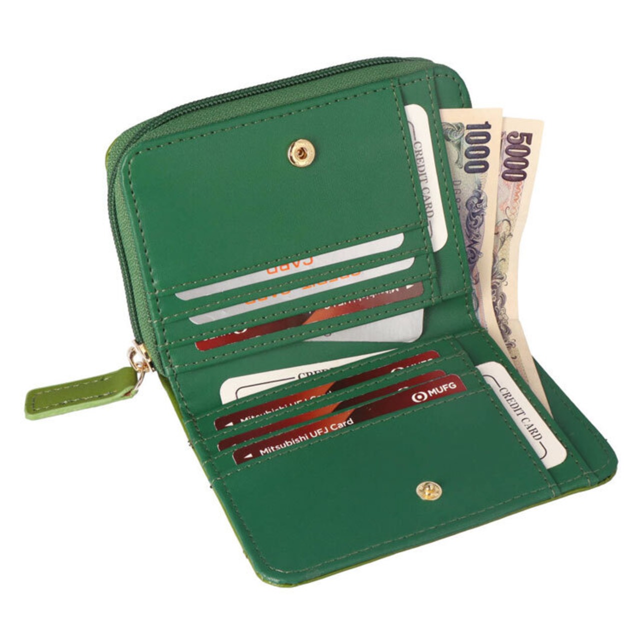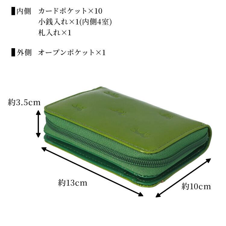 【サイズ(最大部を計測)】縦幅約10cm 横幅約13cm 厚み約3.5cm 【重さ】約130g 【内側収納】カードポケット×10、小銭入れ×1(内側4室)、札入れ×1 【外側収納】カードポケット×1 【留め具】ファスナー 【裏地】有り 【素材】牛革(イタリア製)、合成皮革 【生産国】中国