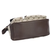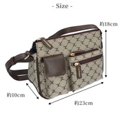 【サイズ(最大部を計測)】縦幅約18cm 横幅約23cm マチ幅約10cm ショルダー調節可 【重さ】約220g 【内側収納】オープンポケット×2、ファスナーポケット×1 【外側収納】無し 【留め具】ファスナー 【素材】ポリエステル、合成皮革 【生産国】中国