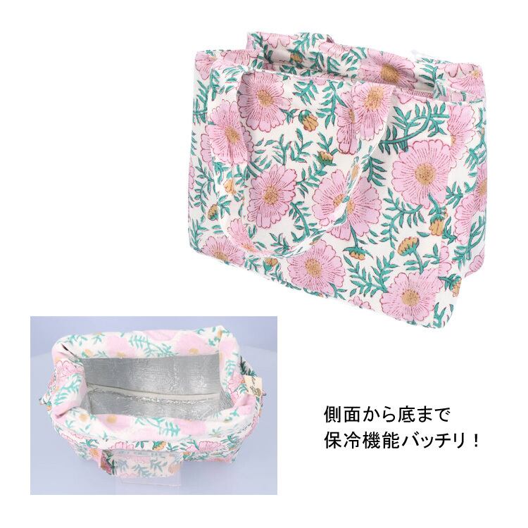 保冷バッグ コンフィーブロックプリント 花柄 巾着 ライトブルー モスグリーン ミントグリーン パープル イエロー ランチバッグ お弁当バッグ クッション 軽量 鞄 ミニバッグ インド製 レディース メンズ バッグ 通勤 通学 ギフト プレゼント PO1672