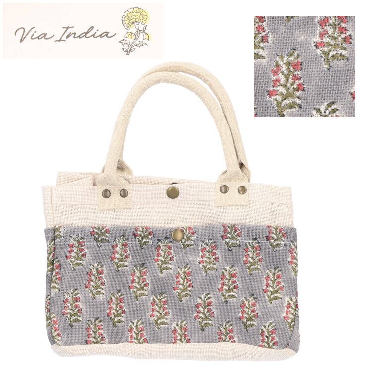 ジュートバッグ スクエア ブロックプリント 6ポケットバッグ 花柄 ジュート ブラウン グレー ホワイト 大容量 天然素材 ランチバッグ お弁当バッグ 軽量 鞄 ミニバッグ インド製 レディース メンズ バッグ 通勤 通学 ギフト プレゼント PO1562