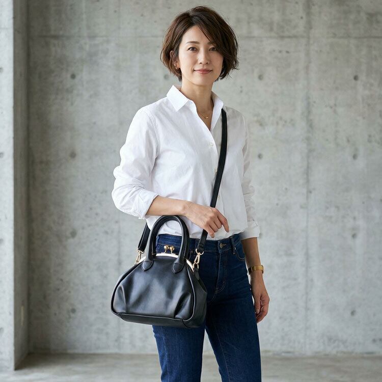 ちょっとしたお出かけに便利な大きさ。前後を問わず持ててコーデを選ばないシンプルデザイン。コロンとした可愛いフォルムですが、長財布やペットボトルも入る収納力。がま口開閉なのでパカっと開いて持ち物の出し入れもしやすいです。