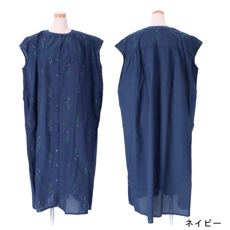 Iラインワンピース LAVENDER Series ロング ノースリーブ ワンピース スレンダーライン エスニック キャンブリック コットン ラベンダー ネイビー サンド フリーサイズ 刺繡 花柄 春 秋 夏 カジュアル 30代 40代 50代 40826 レディース ボタン 綿 薄手 CO4082