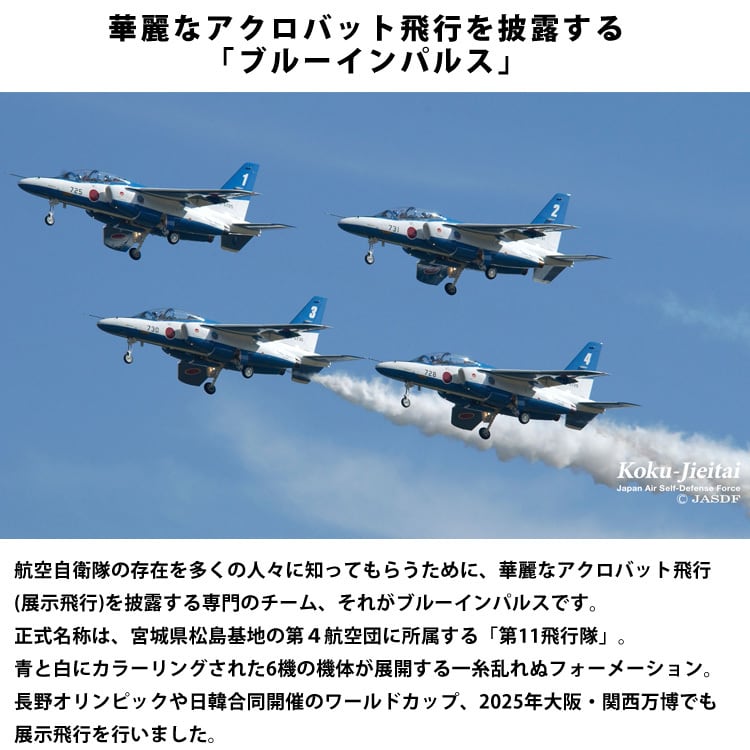 普段、航空自衛隊の基地内ショップでしか購入できないブルーインパルスグッズ。その中から、岐阜基地(岐阜県)・小牧基地(愛知県)内のショップオリジナルデザインドライTシャツです!前面には公式エンブレムをワンポイントに、背面にはオリジナルデザインをプリント。男性、女性問わずご使用できる仕上がりです。表はなめらか、裏はメッシュ生地の、速乾性に優れたこだわりの素材を使用。吸水性も高く、綿の2倍以上の速乾性能があります。洗濯しても型くずれや色あせもしにくく、カジュアルに、スポーツにと幅広く活躍する一着です。